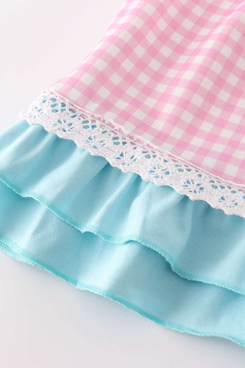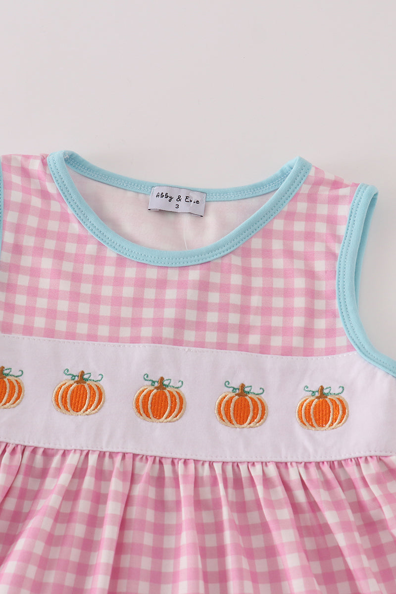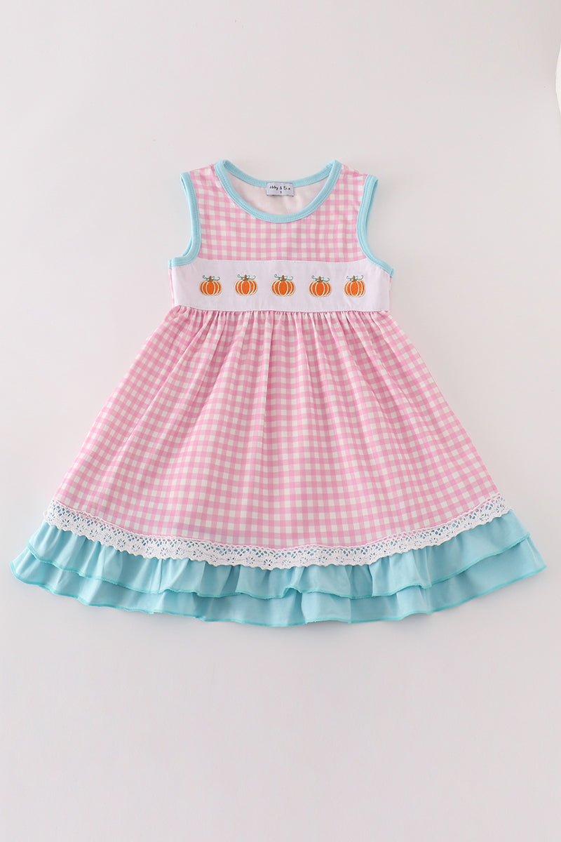 Get ready to fall in love with our Pink Plaid Pumpkin Embroidery Ruffle Dress! This charming dress features an adorable pumpkin embroidery design on a pink plaid background, finished off with playful ruffle details. Perfect for any occasion, this dress will add a touch of whimsy to your wardrobe.