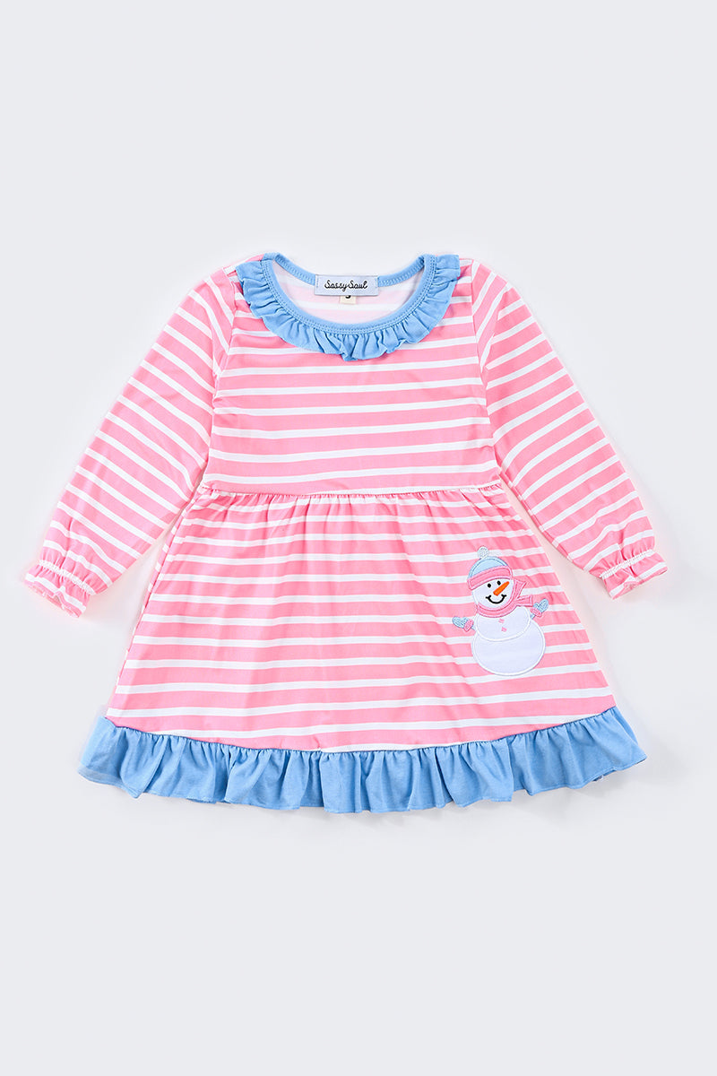 Dress to impress (and stay warm) for the holidays with this pink stripe Christmas snowman applique dress. This winter wonderland-inspired dress will surely bring joy to any festive occasion.