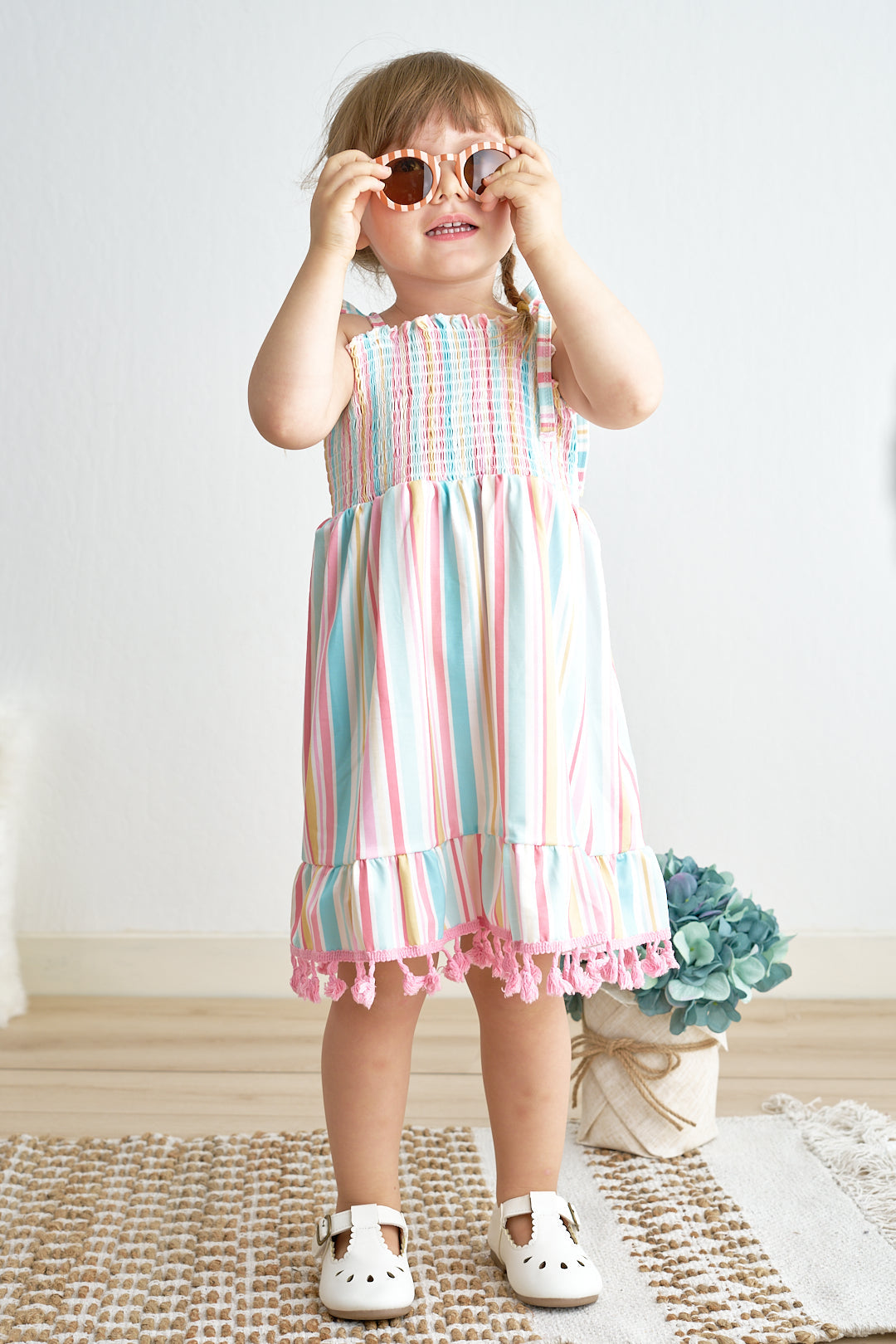 Pink stripe smocked strap dress