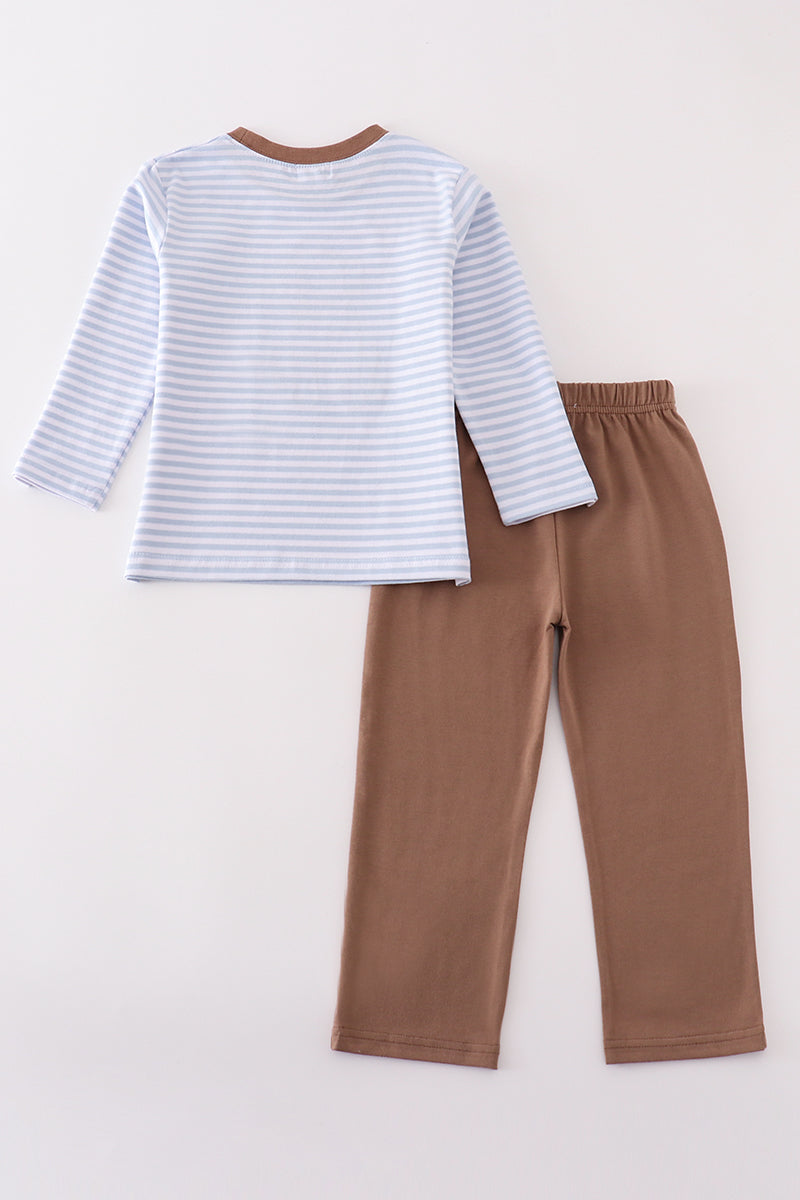 Unleash your little one's style with our Premium Brown Stripe Puppy Applique Boy Set! Featuring a playful puppy design, this set is made with premium brown stripe fabric for both comfort and style. Perfect for your little fashionista (or fashionisto) in the making!