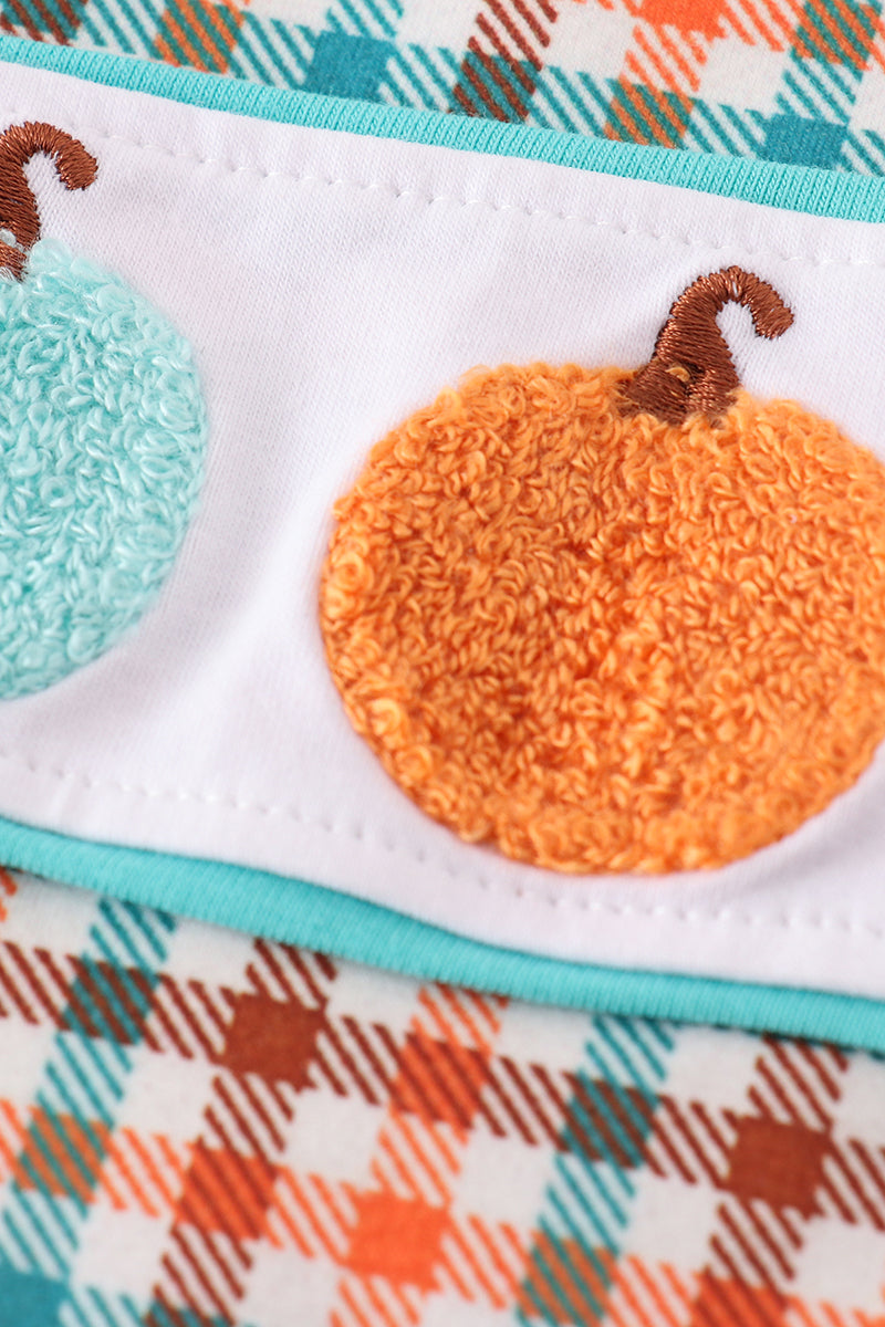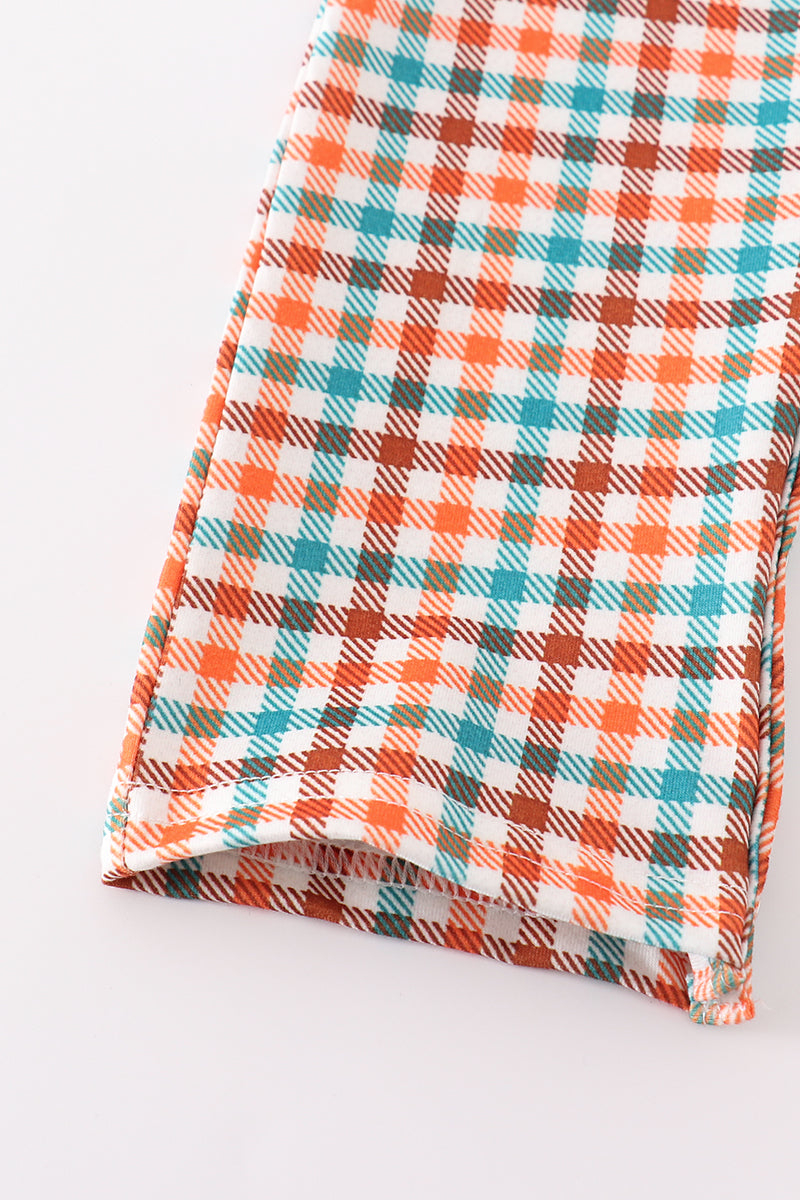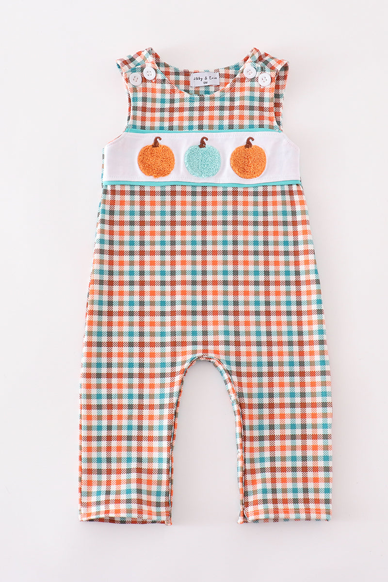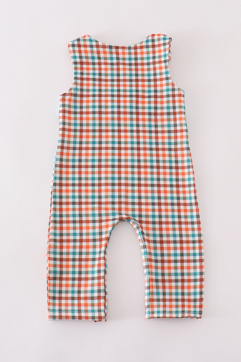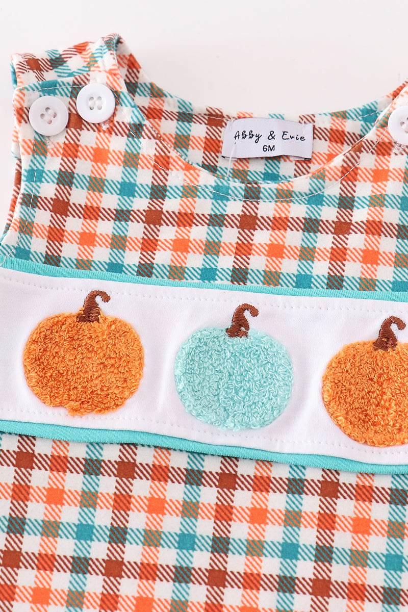 Dress your little pumpkin in this quirky French knot gingham jonjon. With playful pumpkin details and a charming gingham pattern, this outfit is perfect for any fall occasion. Get ready for compliments galore!