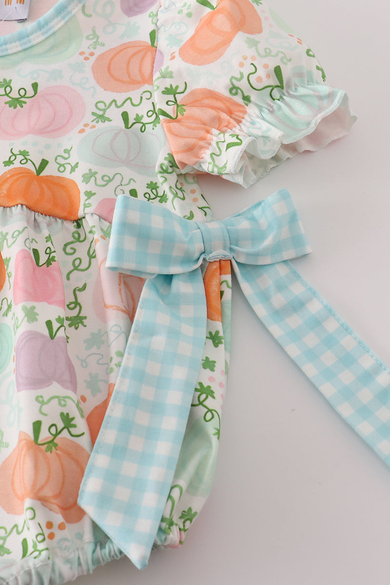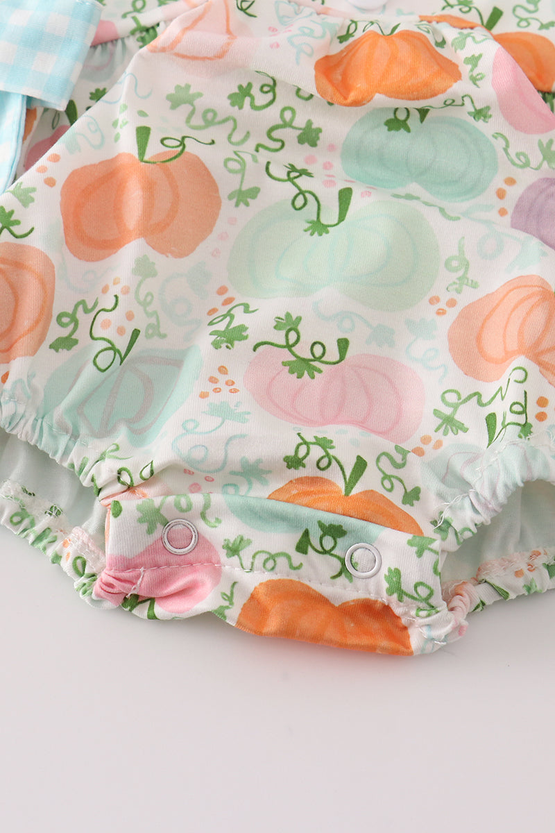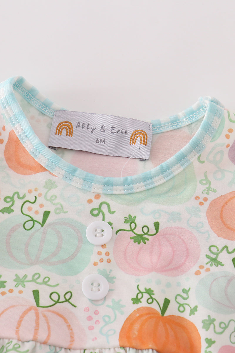Get festive with this adorable pumpkin print ruffle girl bubble! The playful design adds a touch of fun to any outfit. Perfect for your little one's fall adventures, this bubble offers comfort and style. (Pumpkin patch approved!)
