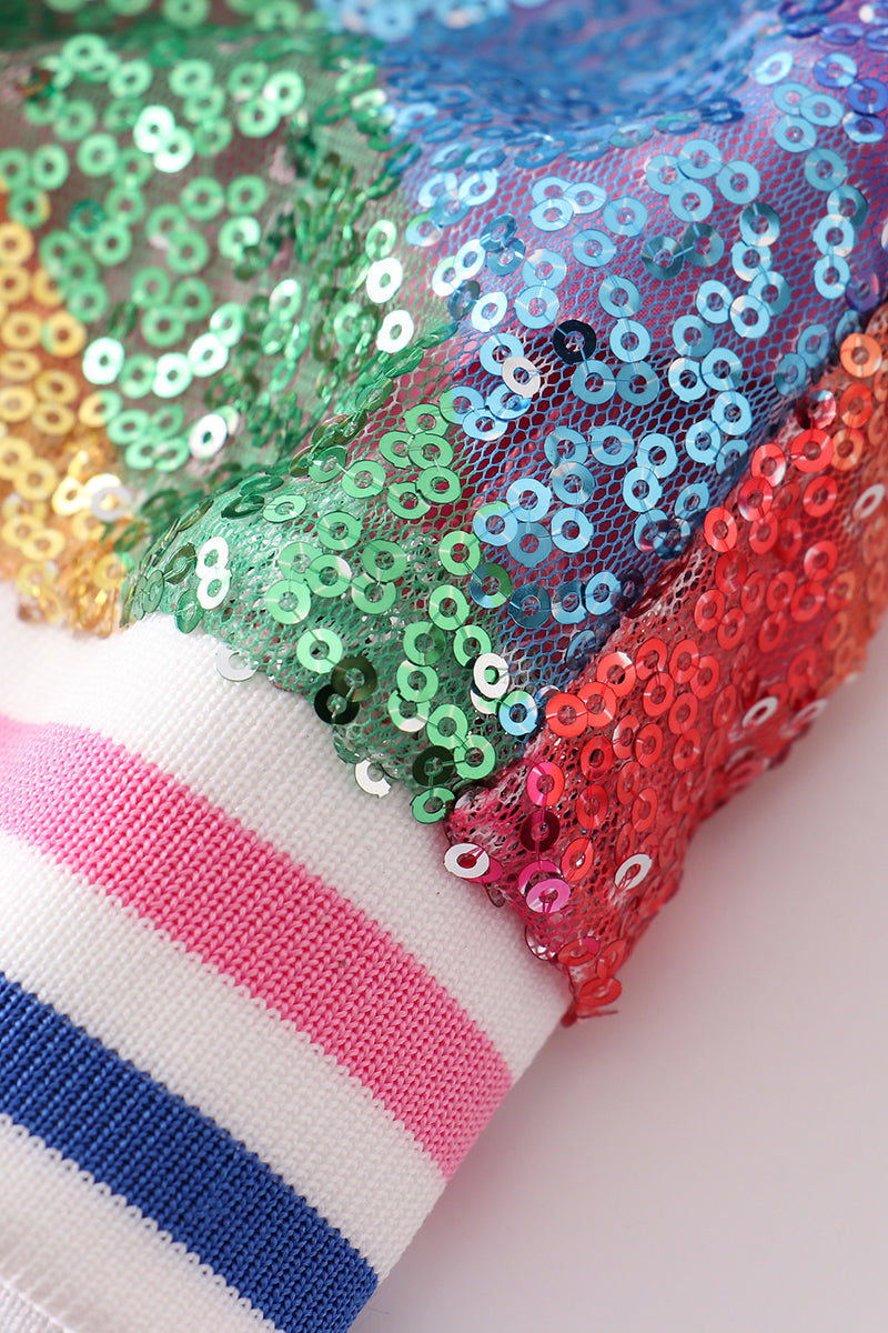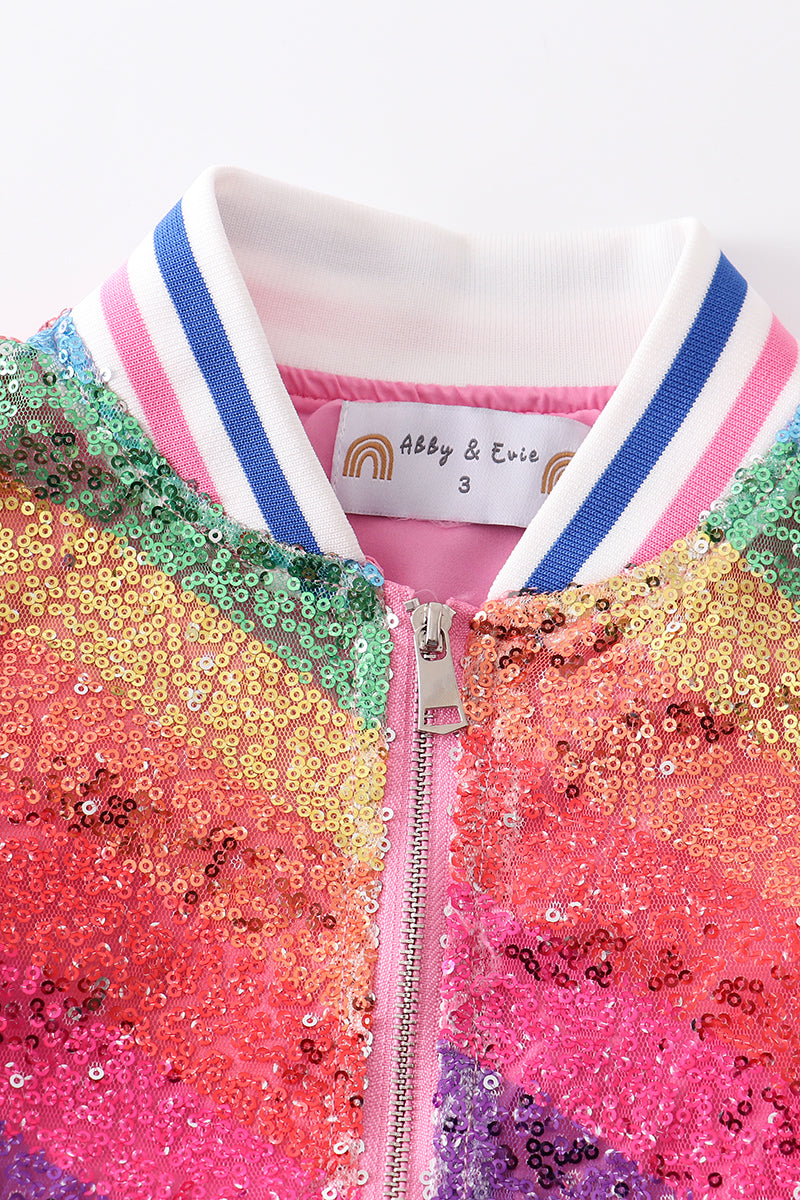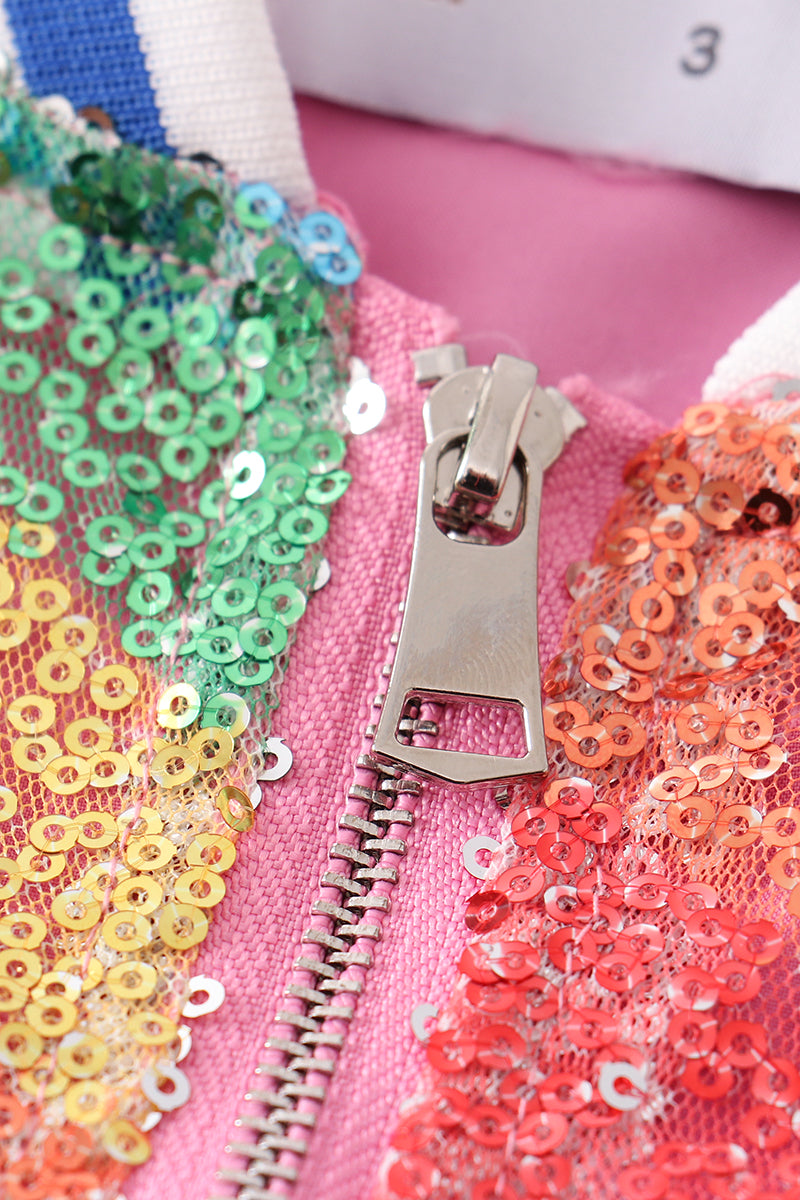 Add some sparkle to your wardrobe with our Rainbow Sequin Bomber Jacket! With rainbow sequins, this jacket will make you stand out in any crowd. Perfect for parties, festivals, or just everyday wear, our jacket will surely make a statement! (Warning: May cause excessive attention and compliments.)