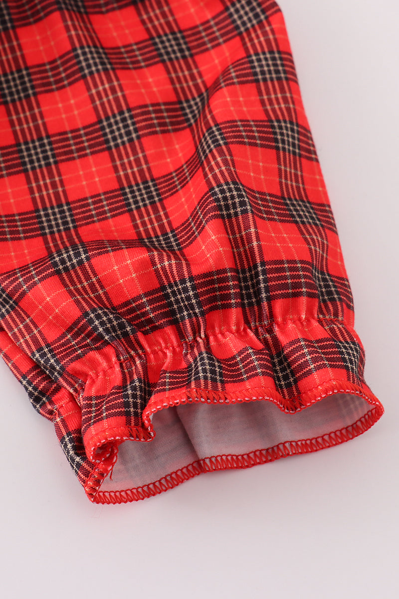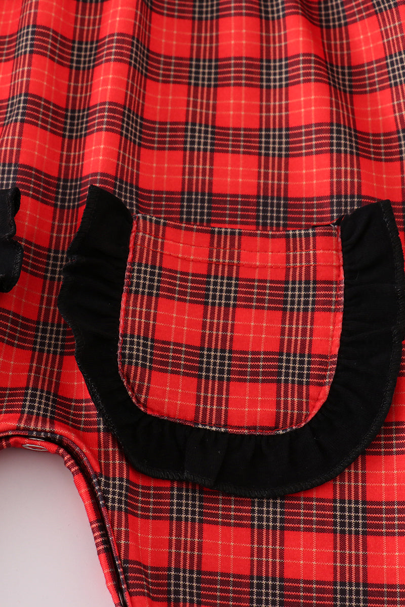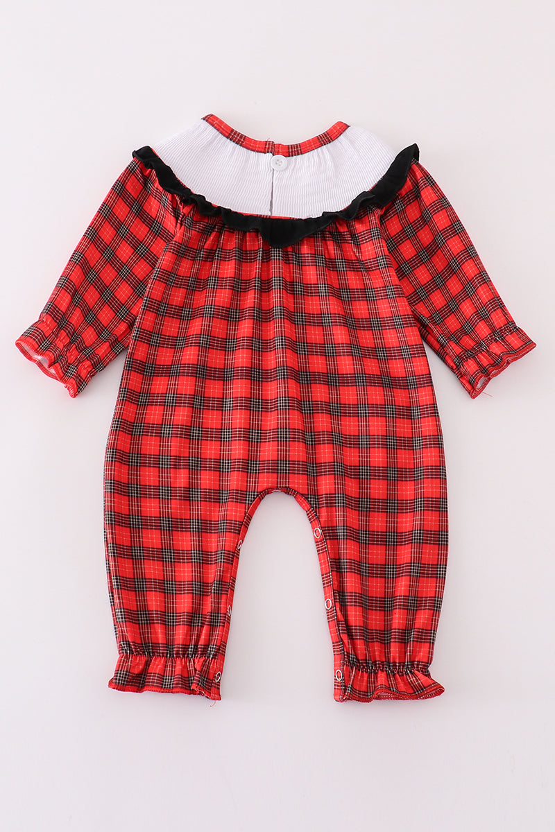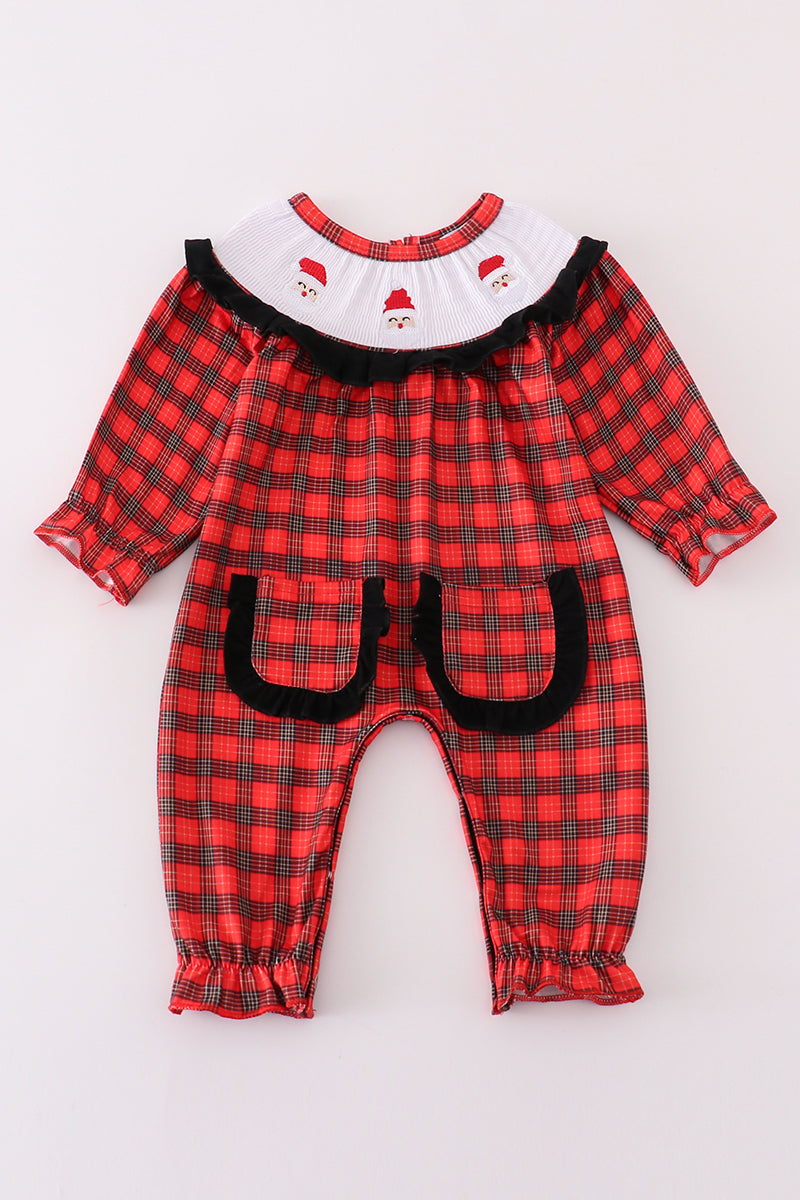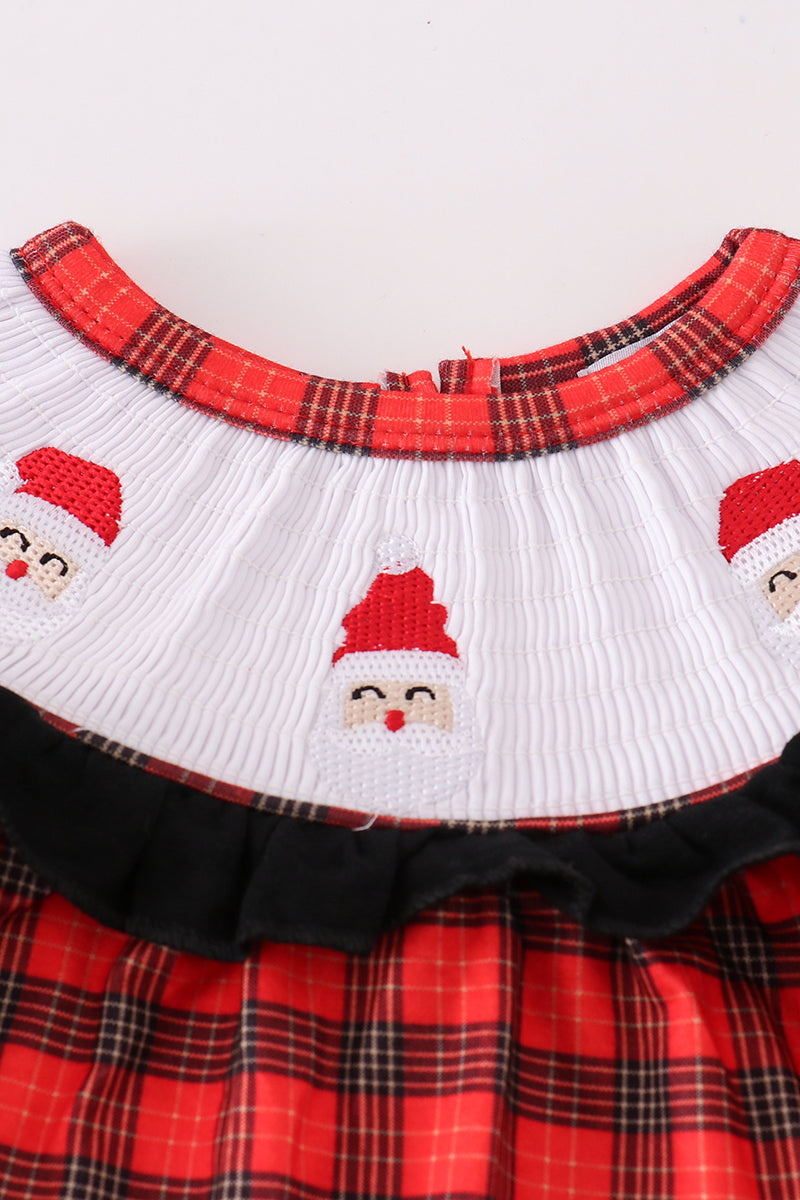 Red christmas santa embroidery smocked plaid girl bishop romper