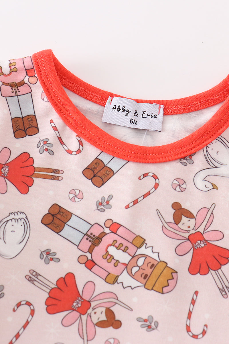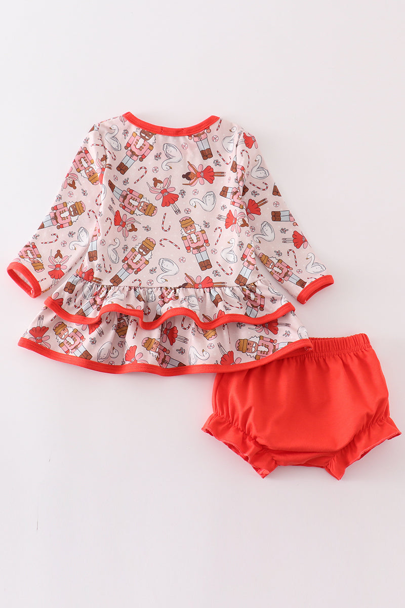 This bloomer set features a playful red nutcracker design that is sure to add a touch of whimsy to any little girl's wardrobe. Made with high-quality materials, it is both comfortable and stylish. Perfect for holiday photos and festive occasions, this set is a must-have for any fashion-forward child.