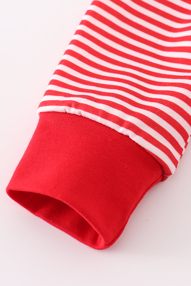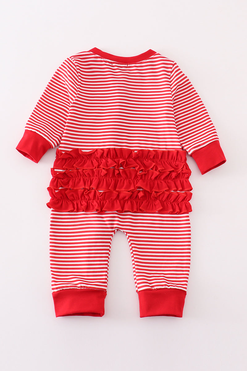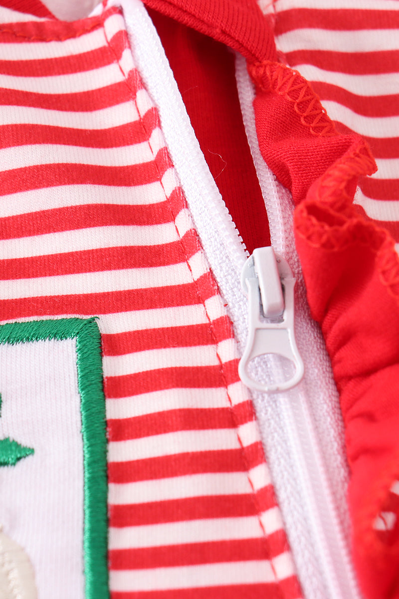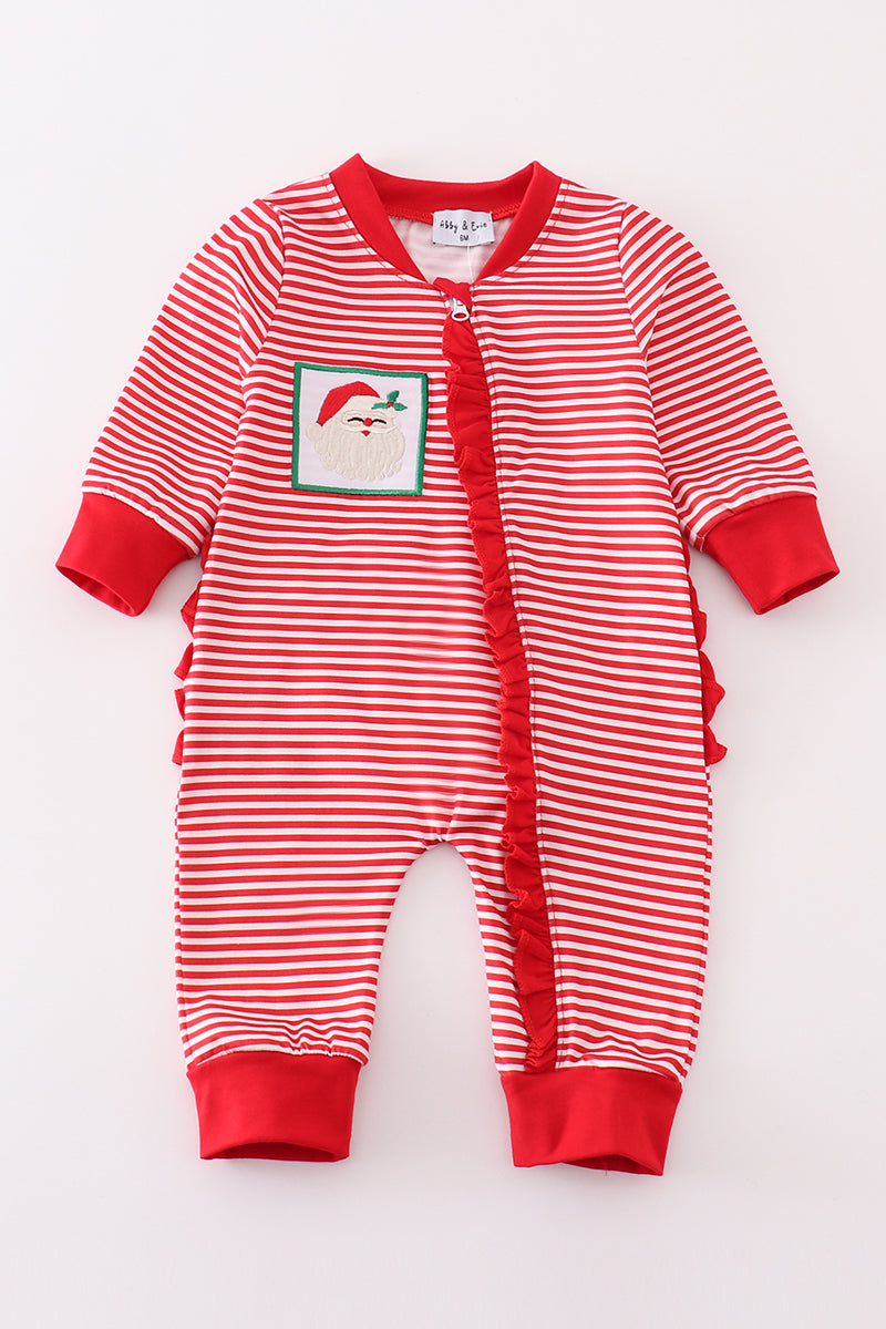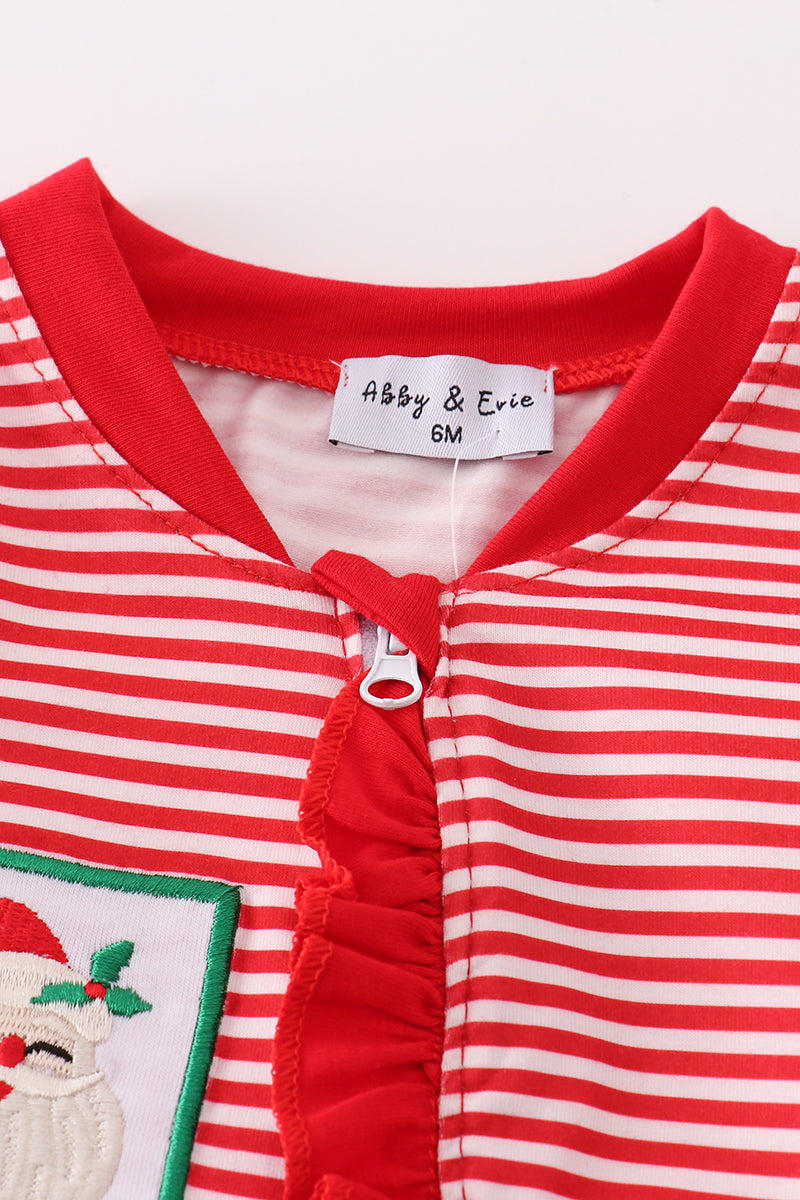 Get ready for holiday cheer with this festive red stripe romper featuring a cute Santa Claus design and easy zipper closure. Perfect for your little one to rock during the Christmas season.