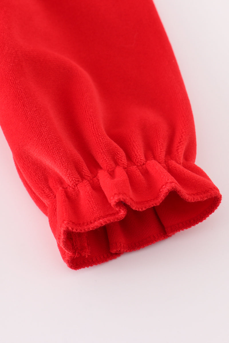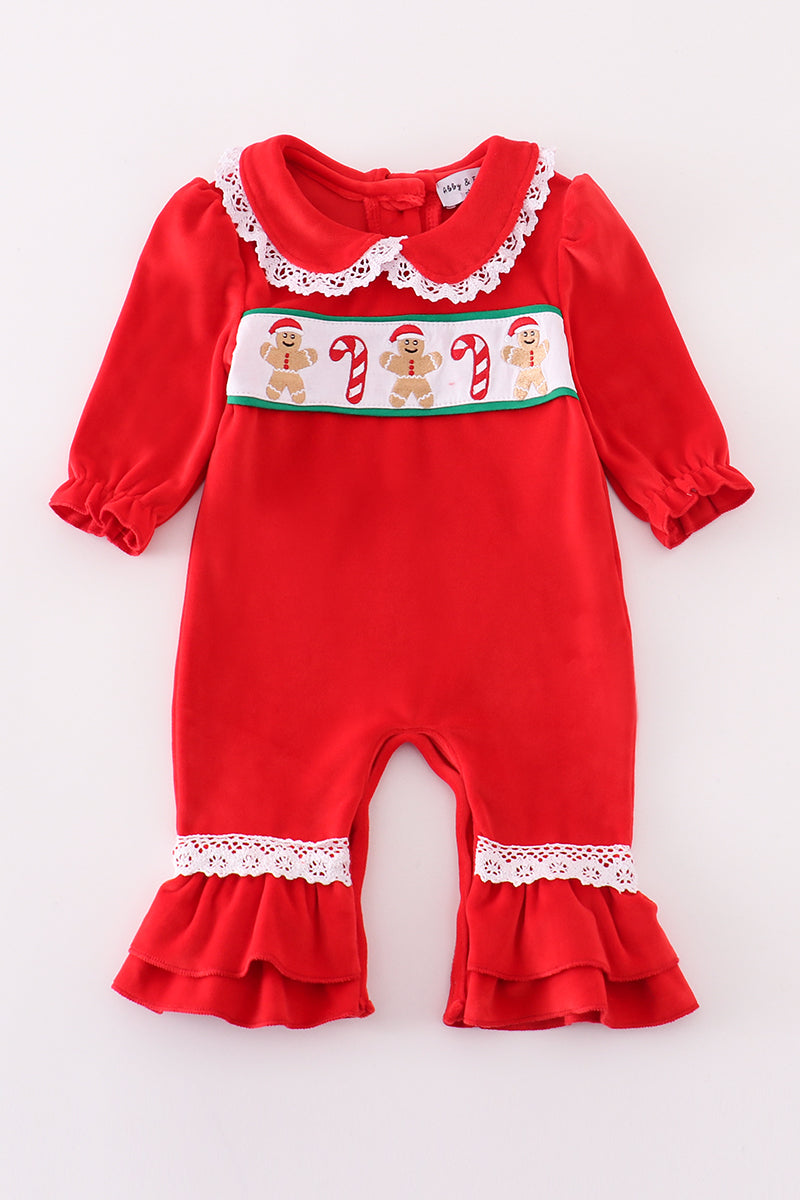 Get your little one in the holiday spirit with this adorable red velvet romper featuring festive gingerbread embroidery and playful ruffles. Perfect for family gatherings and holiday photos. Don't miss out, add some sweetness to your little girl's wardrobe!