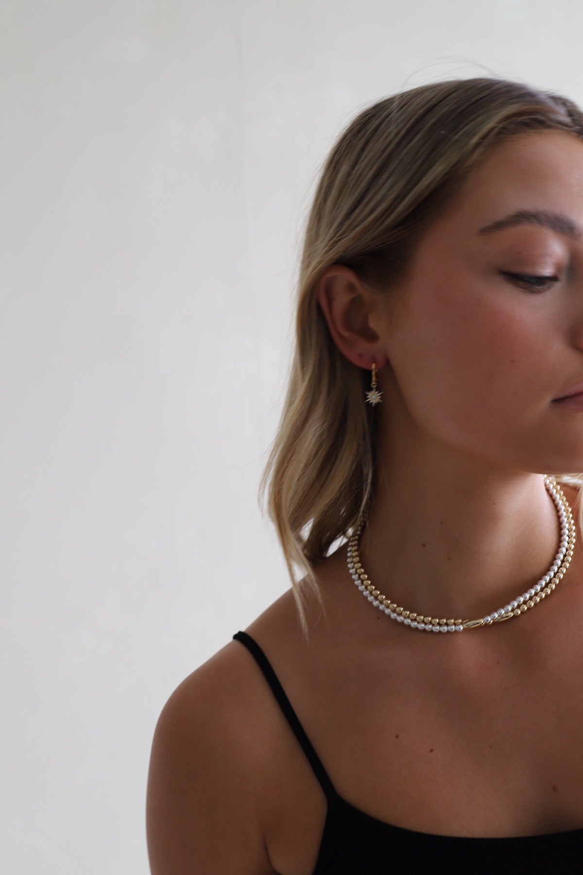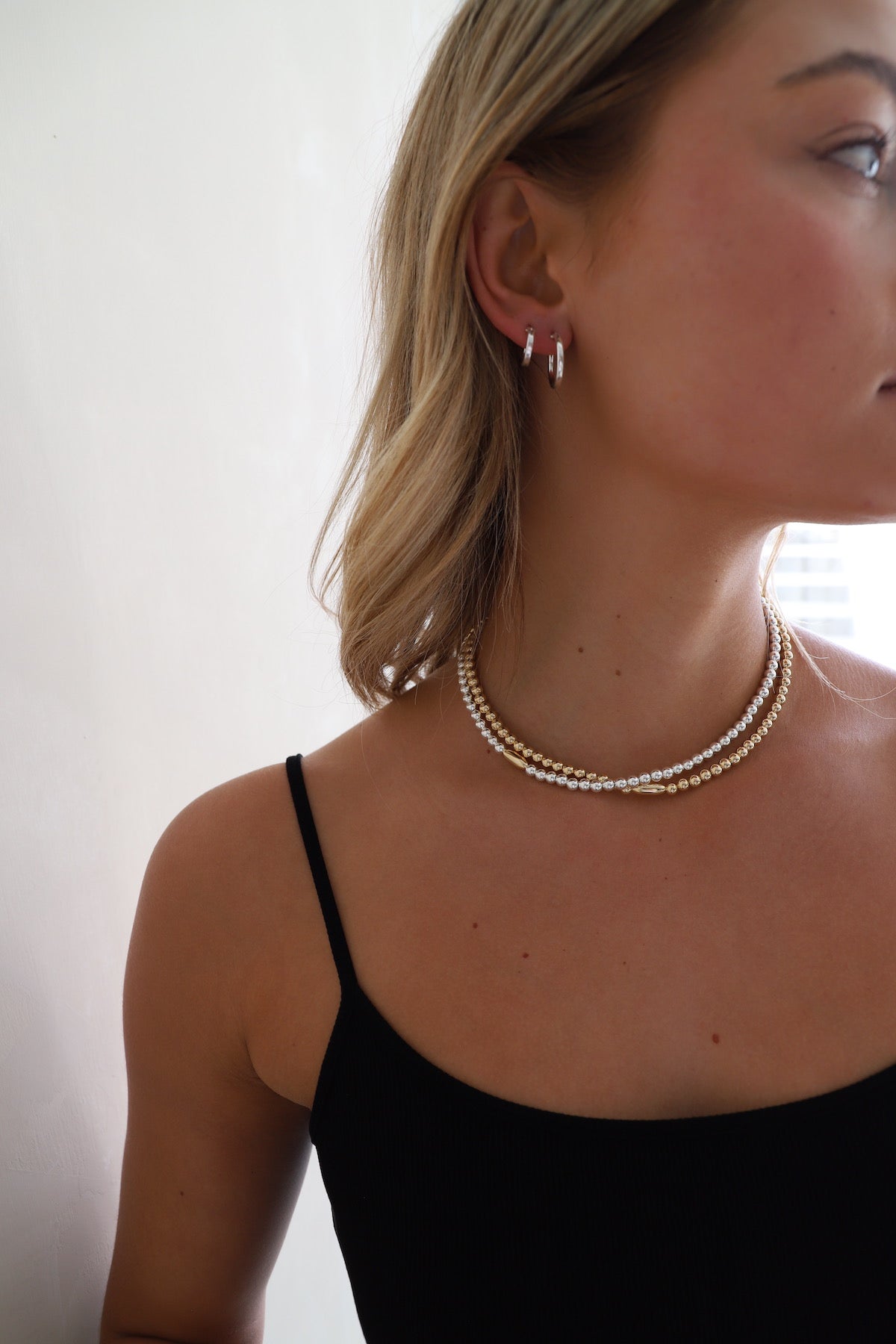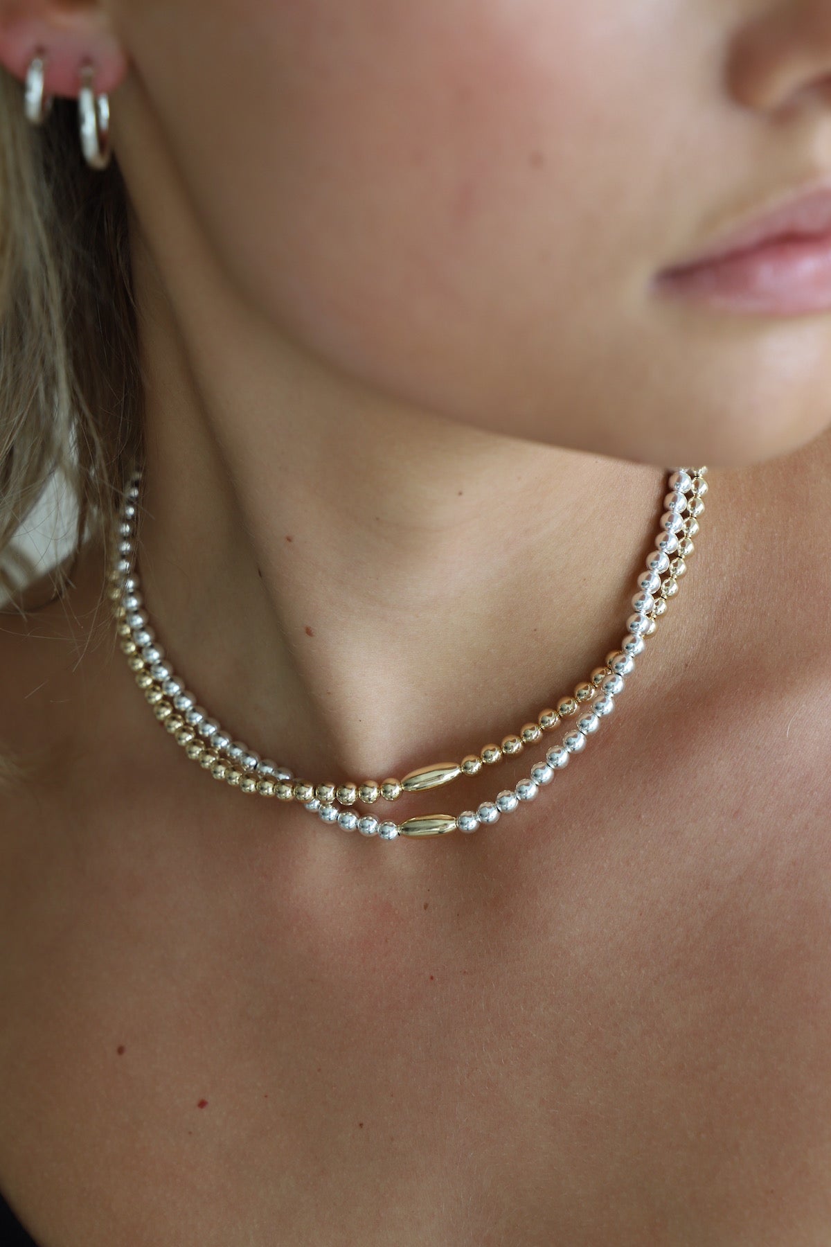Introducing the Roman Necklace, adorned with gold or two tone-beaded accents, including a striking gold oval center bead. Elevate any outfit with this timeless and elegant piece. Available in gold and two-tone options.