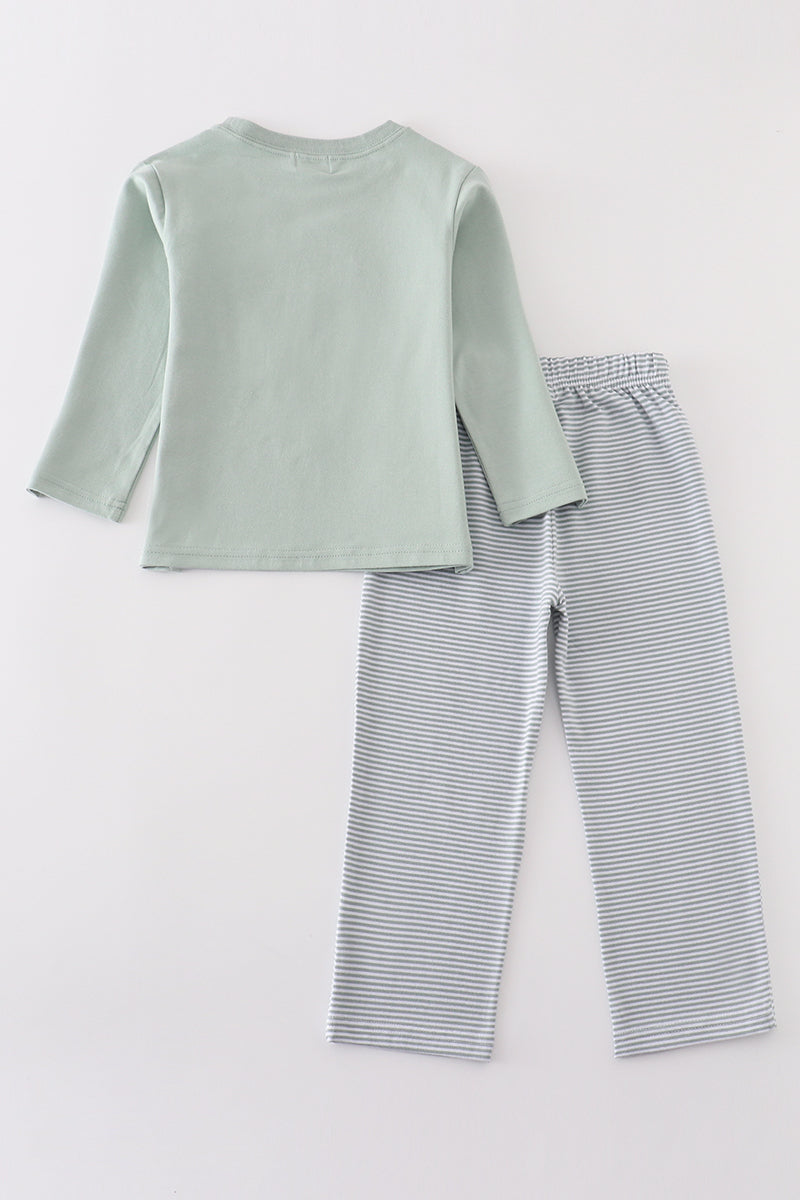 Gobble up the compliments with our Sage Turkey Applique Boy Set! Adorned with a charming turkey applique, this set is perfect for any Thanksgiving celebration. Made from soft and durable materials, it's comfortable and stylish for your little one. Get it now before it's gone!