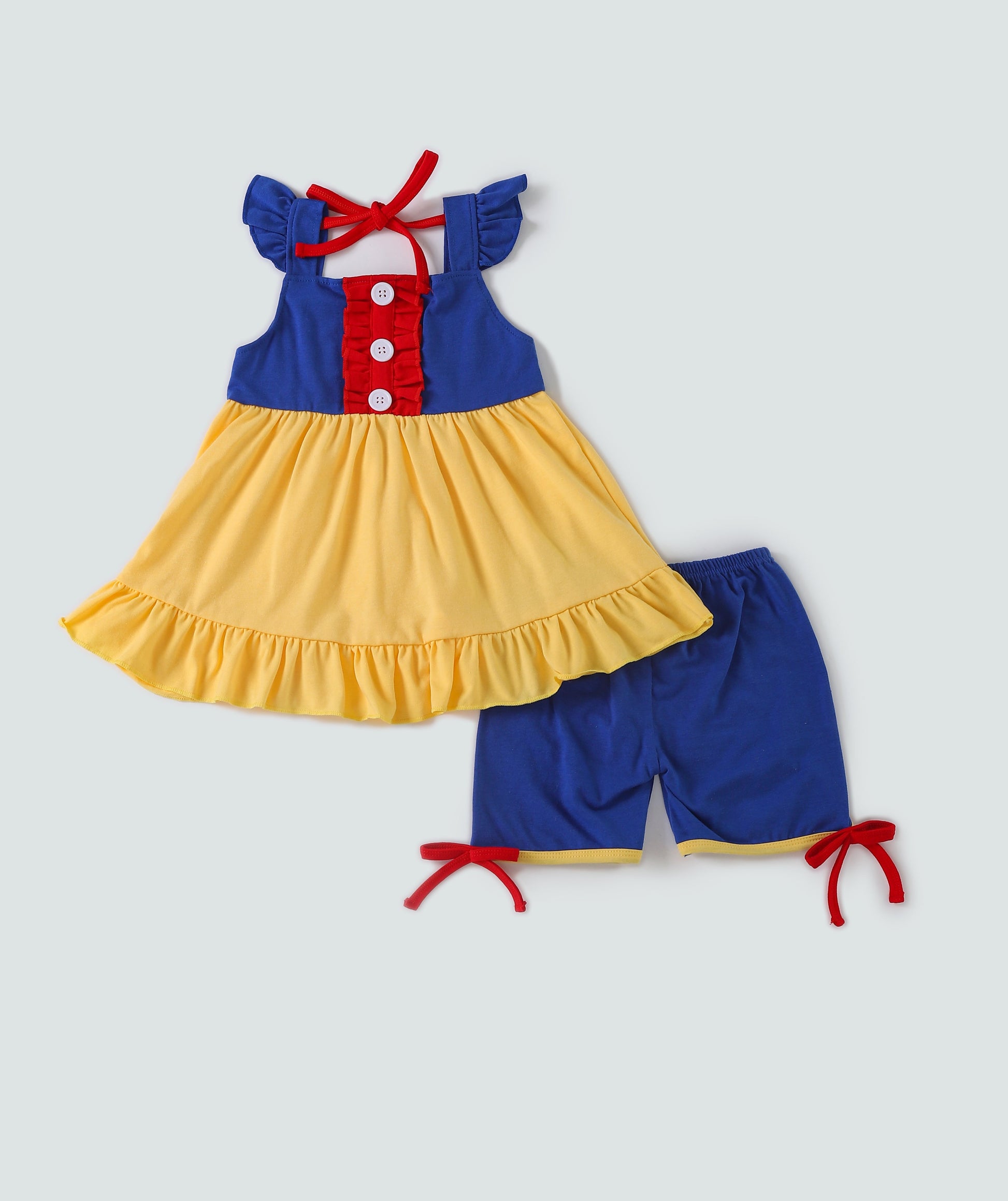 Dress your little princess in this Snow White inspired ruffle girl set for the ultimate fairytale look. The cute ruffles and vibrant colors will make her feel like a true Disney princess. Perfect for costumes, parties, or everyday wear. Feel like royalty with this adorable outfit!