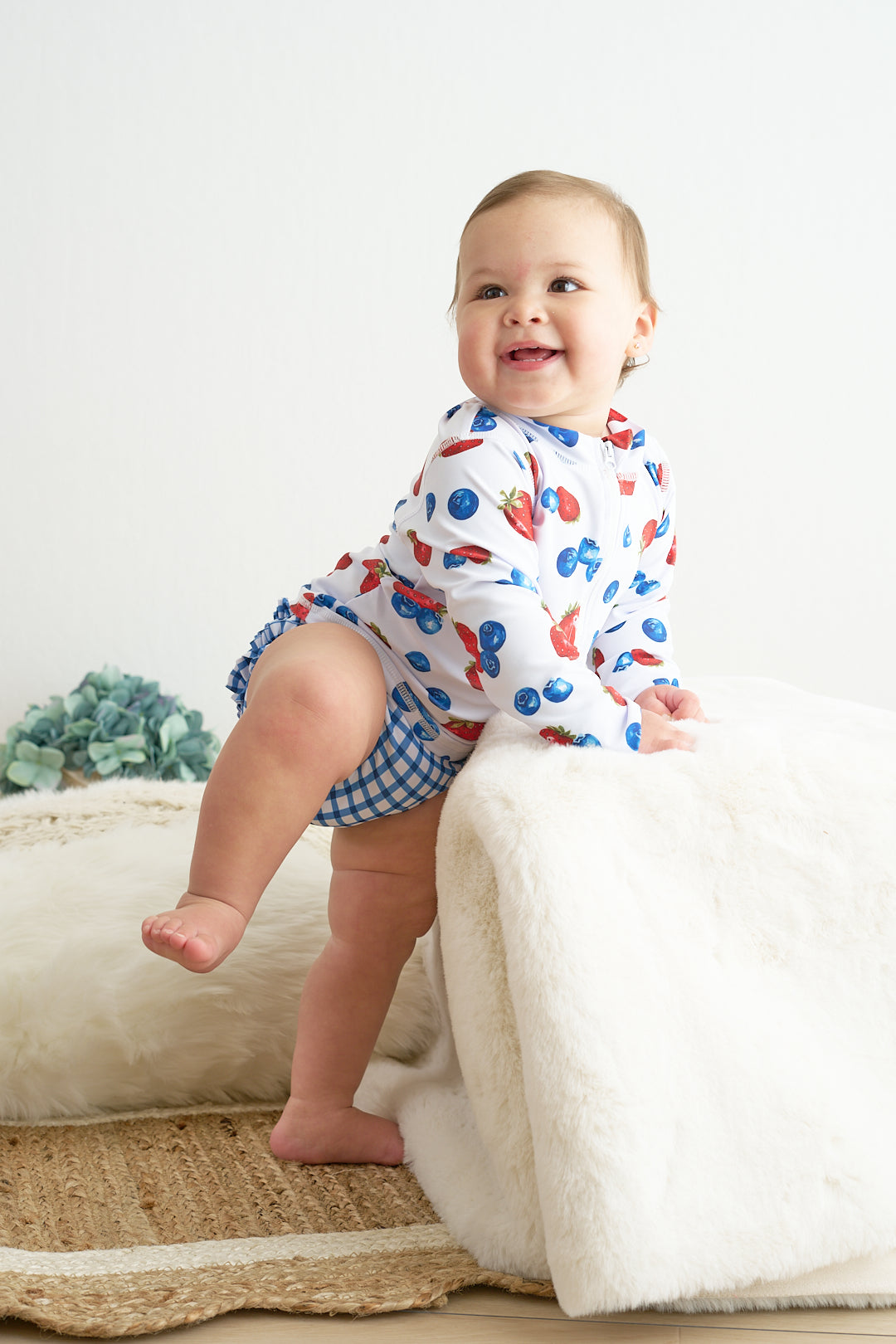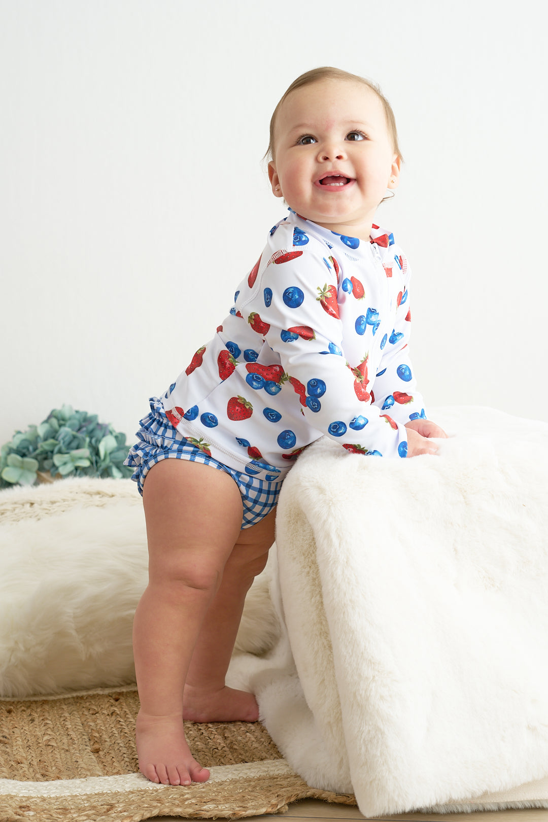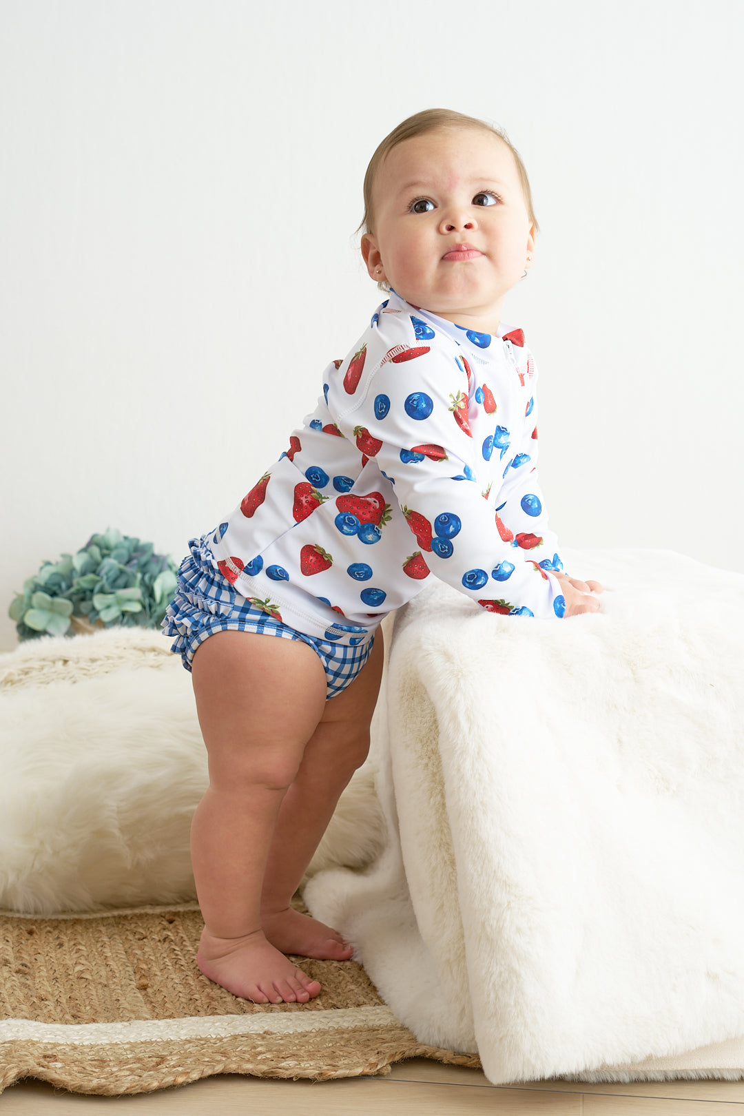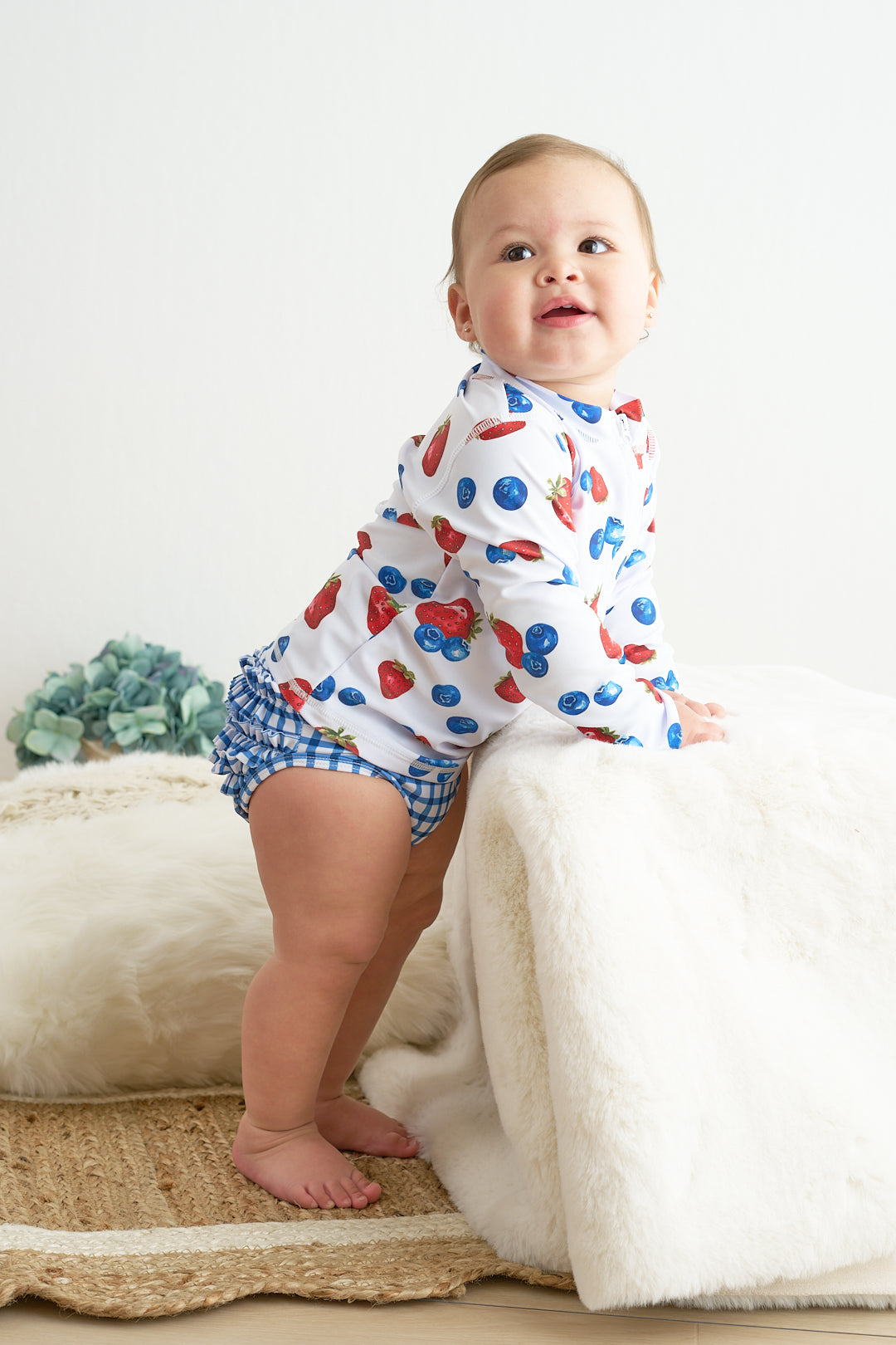 Protect your child from the sun in style with this adorable strawberry print 2pc long sleeve rashguard swimsuit. Made with UPF50+ fabric, it's perfect for a day at the pool or beach. Keep them safe and cute at the same time!