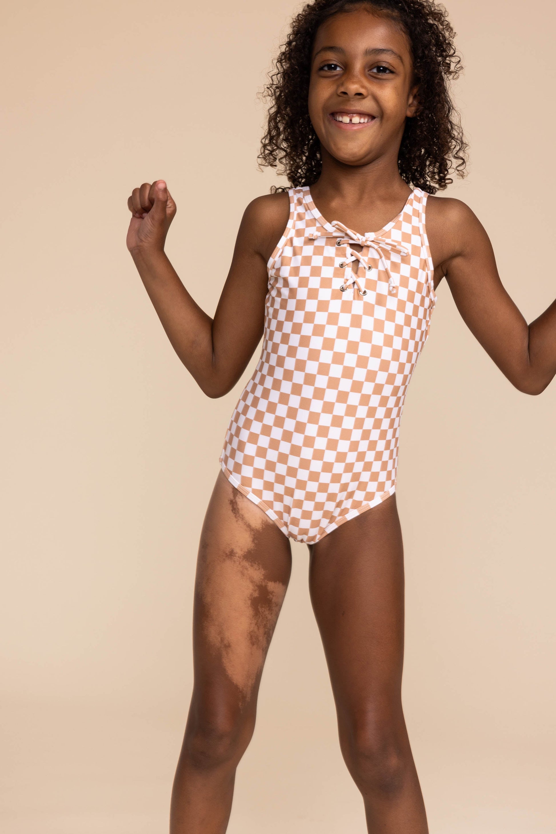 Add a touch of charm to your little girl's swim collection with our playful tan plaid tie one piece swimsuit. Made with high-quality materials, this swimsuit is perfect for a day at the beach or pool. Comfortable and stylish, your little one will love making a splash in this unique suit.