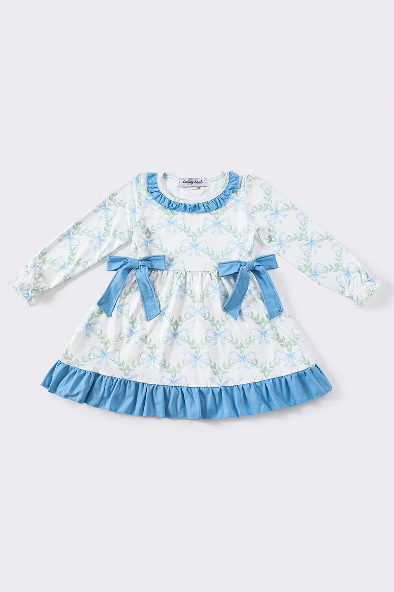 Add a touch of whimsy to your little girl's wardrobe with our Teal bow floral dress. Featuring a playful bow accent and a charming floral print, this dress is perfect for any occasion. Bring out her unique style with this enchanting piece!