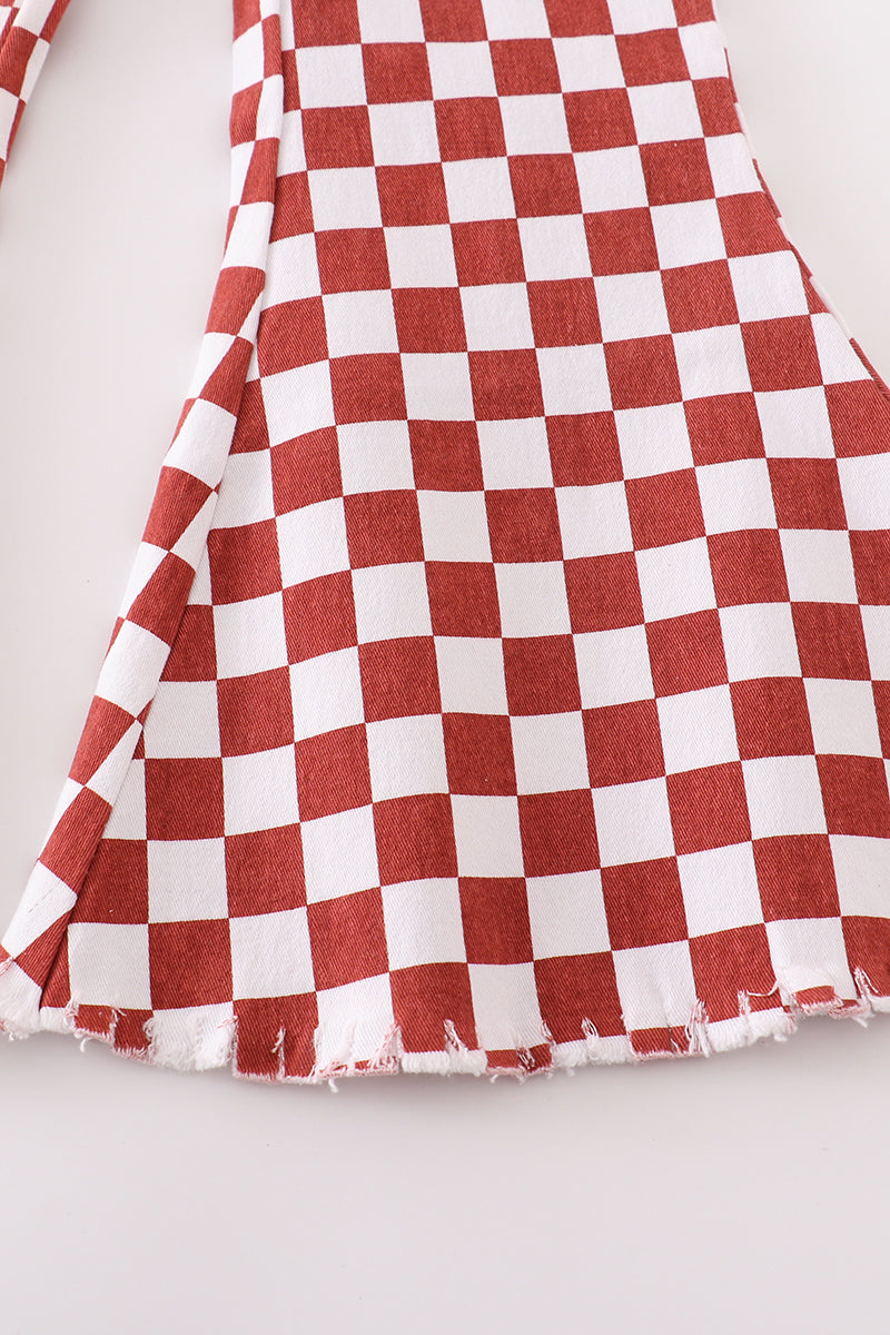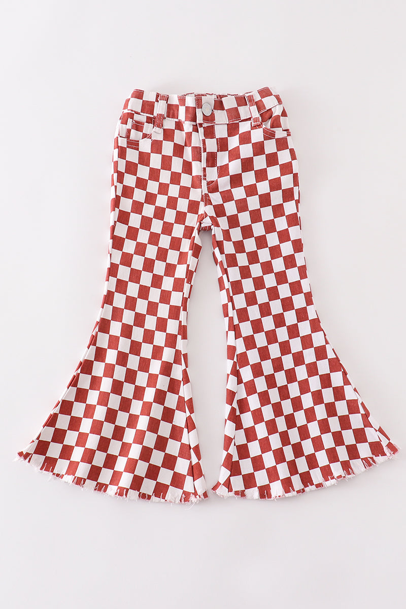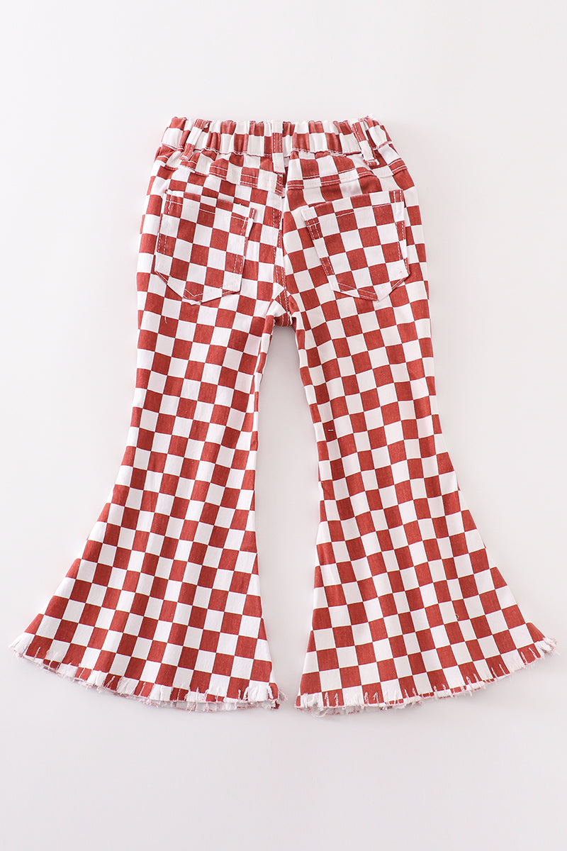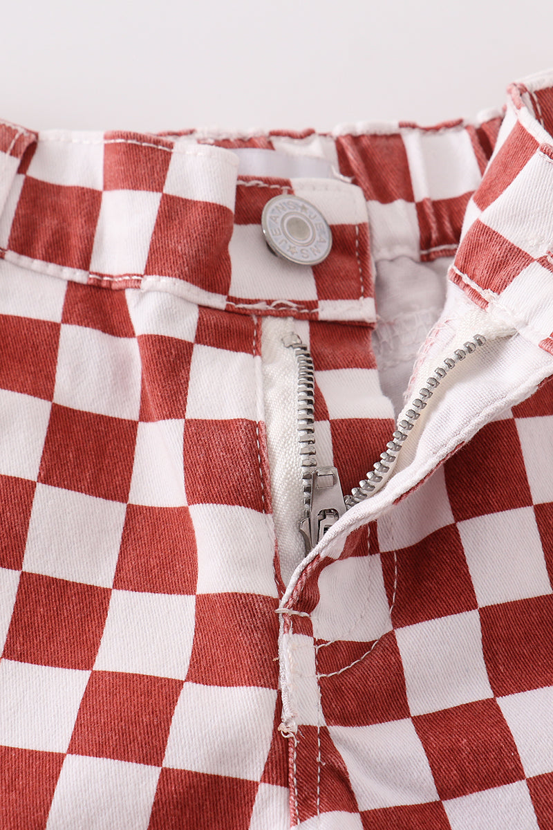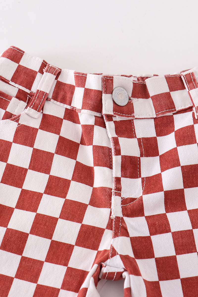 Get ready to step up your fashion game with these terracotta checkered denim jeans. The unique checkerboard design adds an unexpected twist to a classic denim look. Stay stylish and playful with these one-of-a-kind jeans. (Slay in style!)