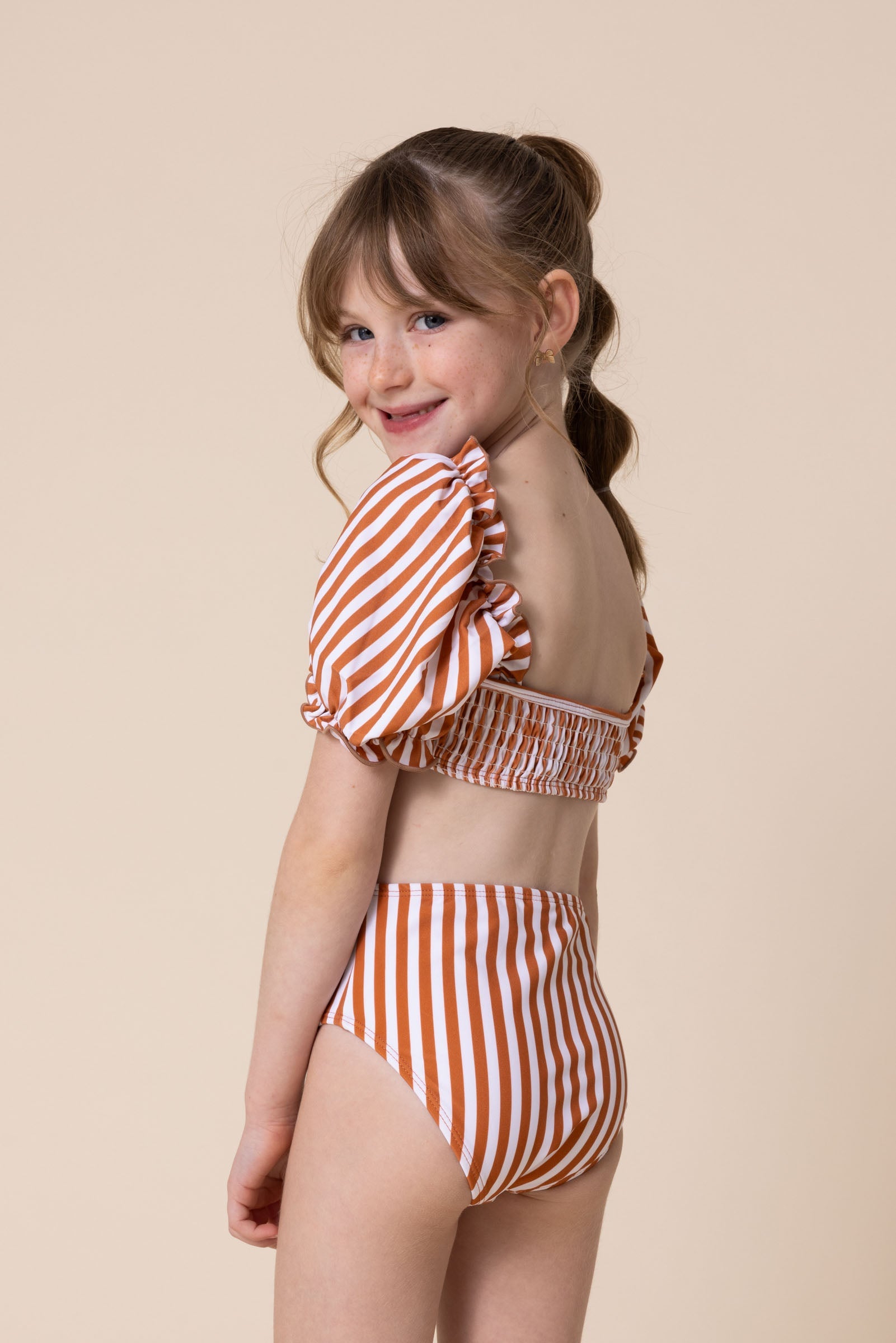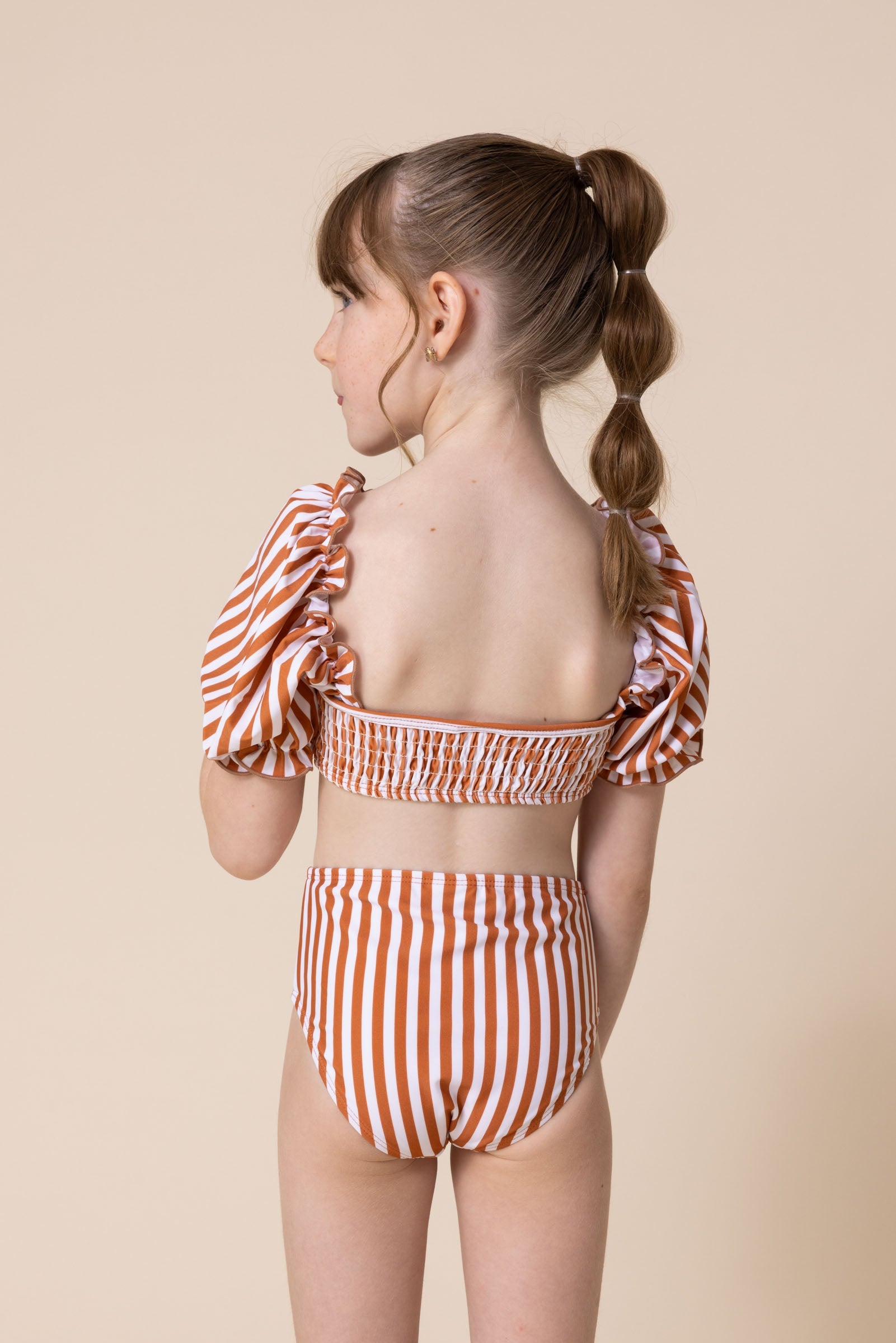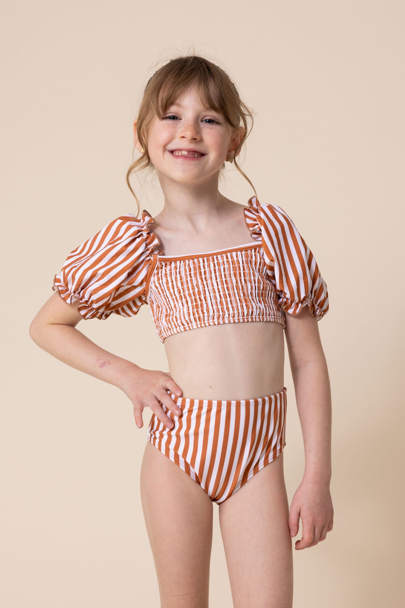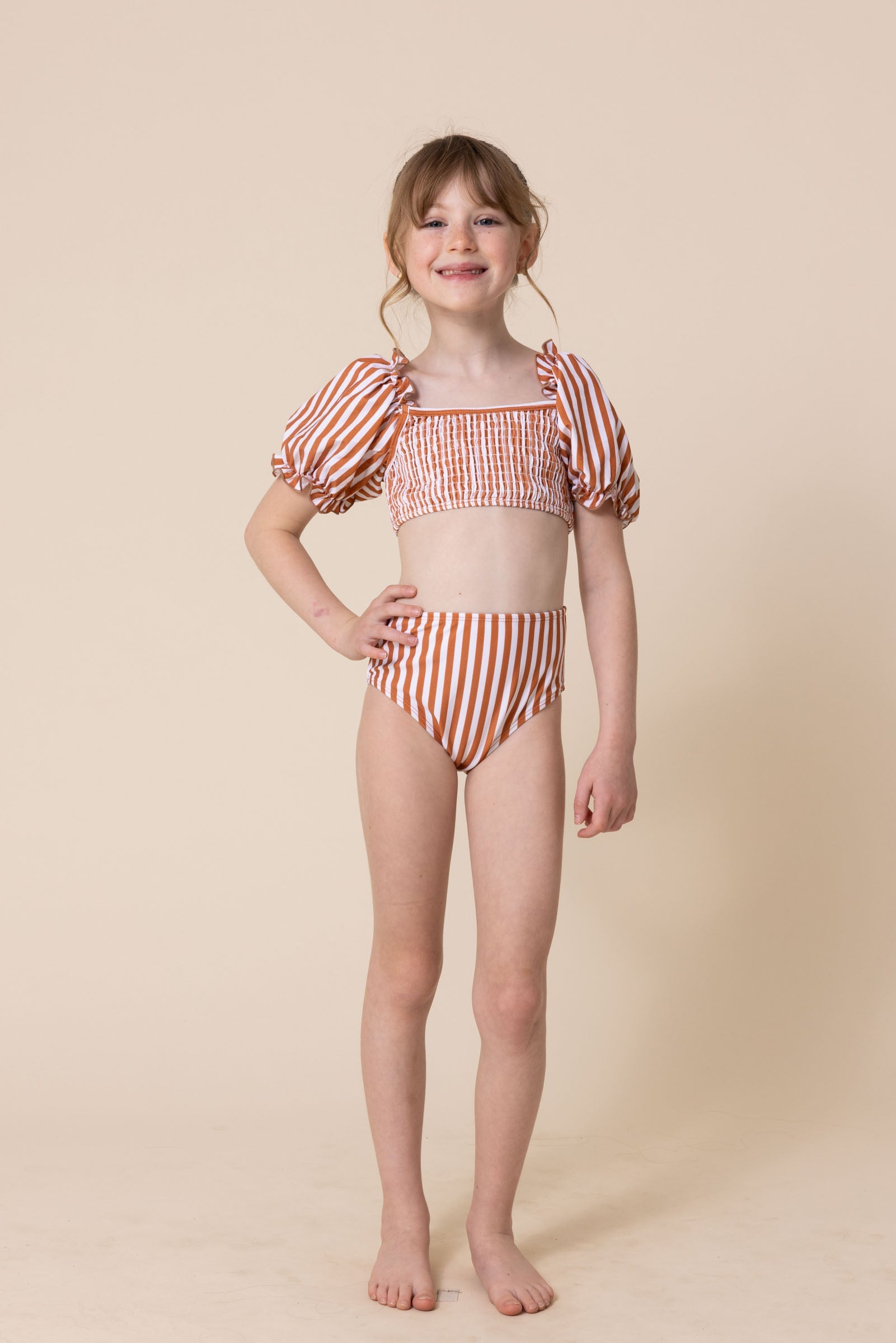 Terracotta stripe smocked 2pc girl swimsuit (size run small, go up 2-3 sizes)