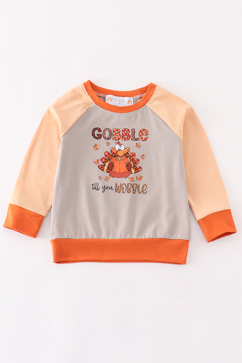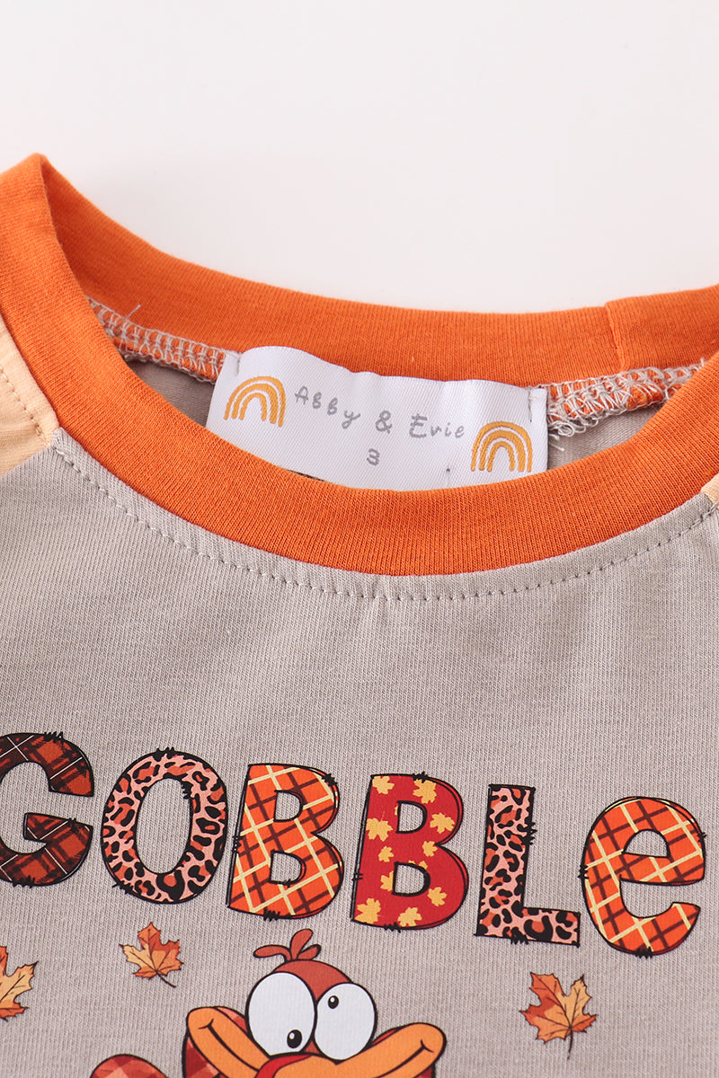 Gobble up the compliments with our Thanksgiving turkey GOBBLE boy top! Stand out at the feast with this quirky and fun top, featuring a festive turkey design. Perfect for a playful and lighthearted celebration.