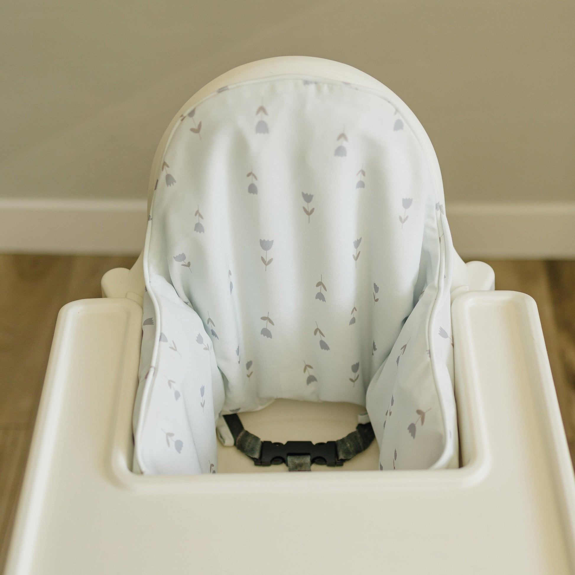 Blue tulips printed on white! Wipeable cushion cover for the IKEA Antilop Highchair