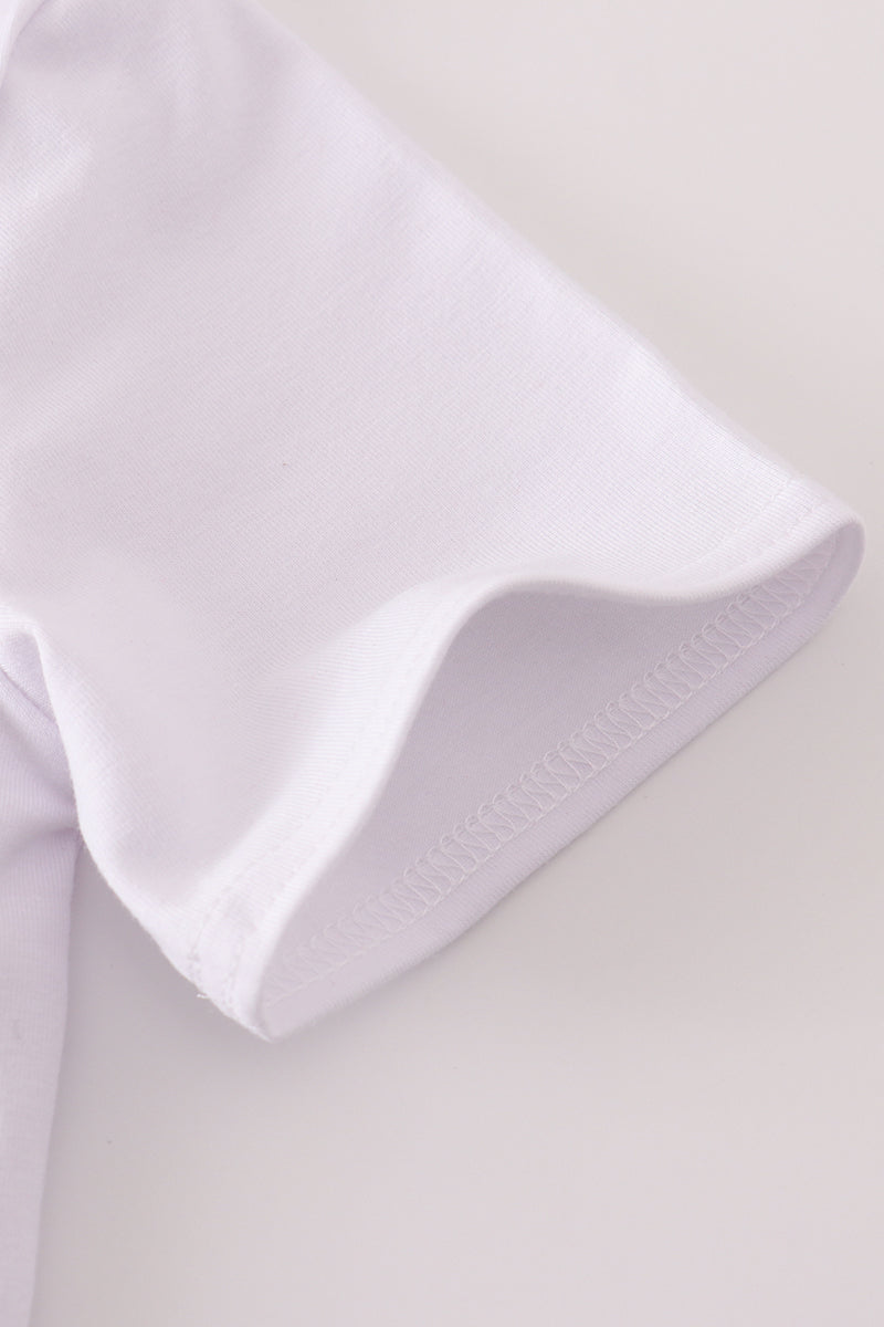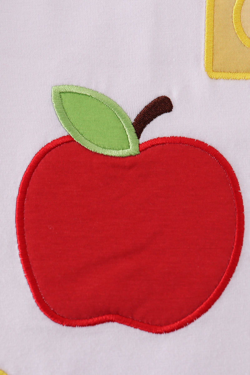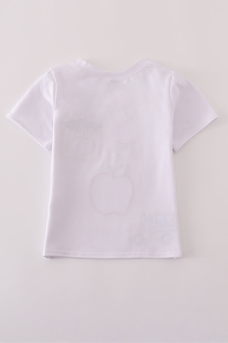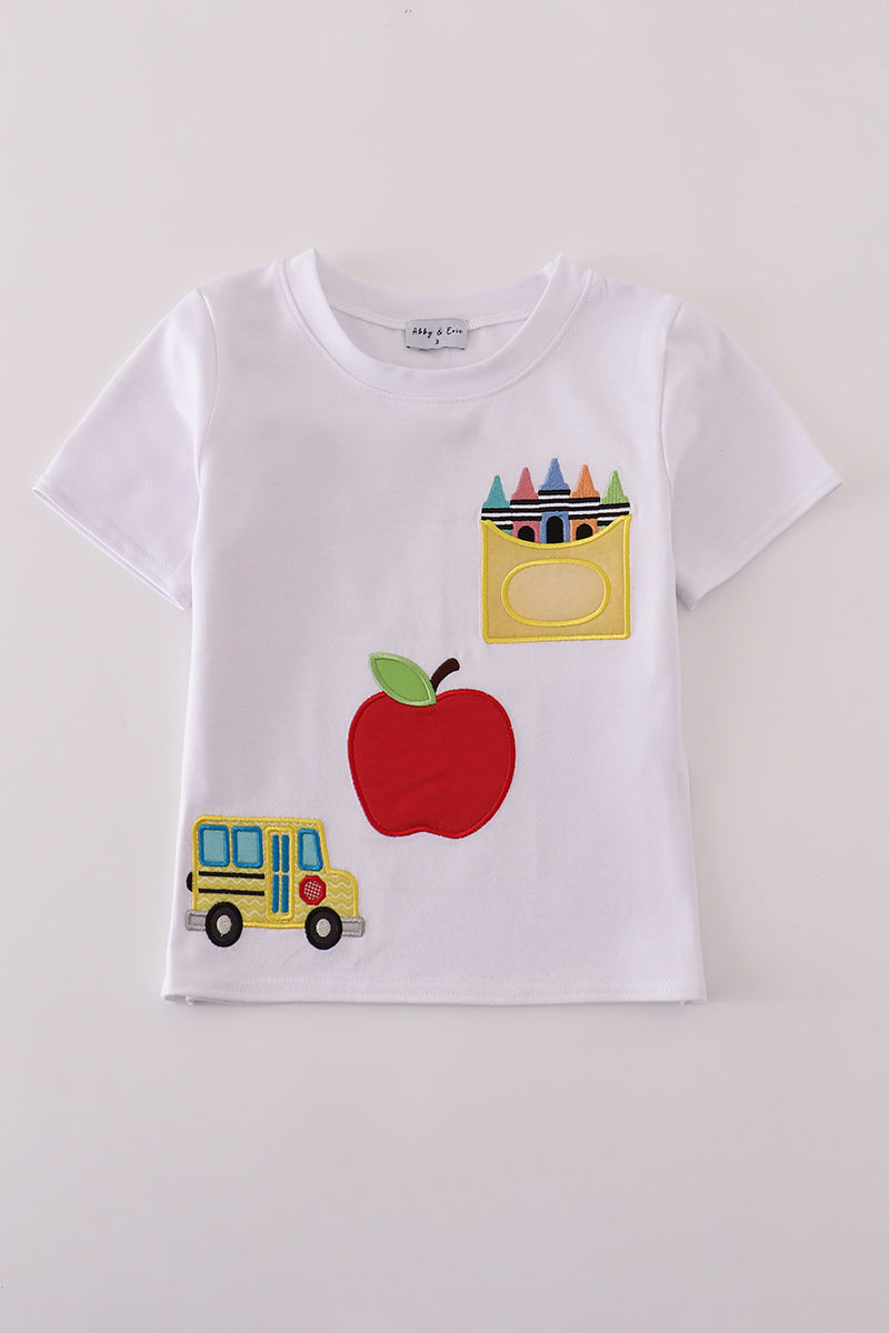 This playful white top features a charming bus and apple applique design that adds a whimsical touch to any outfit. Perfect for casual outings or themed events, the unique applique details make this piece stand out while maintaining everyday wearability. The crisp white background lets the colorful design truly pop!