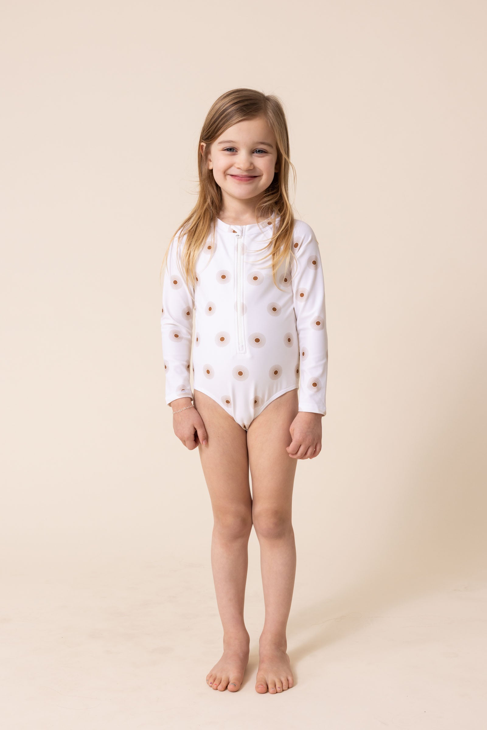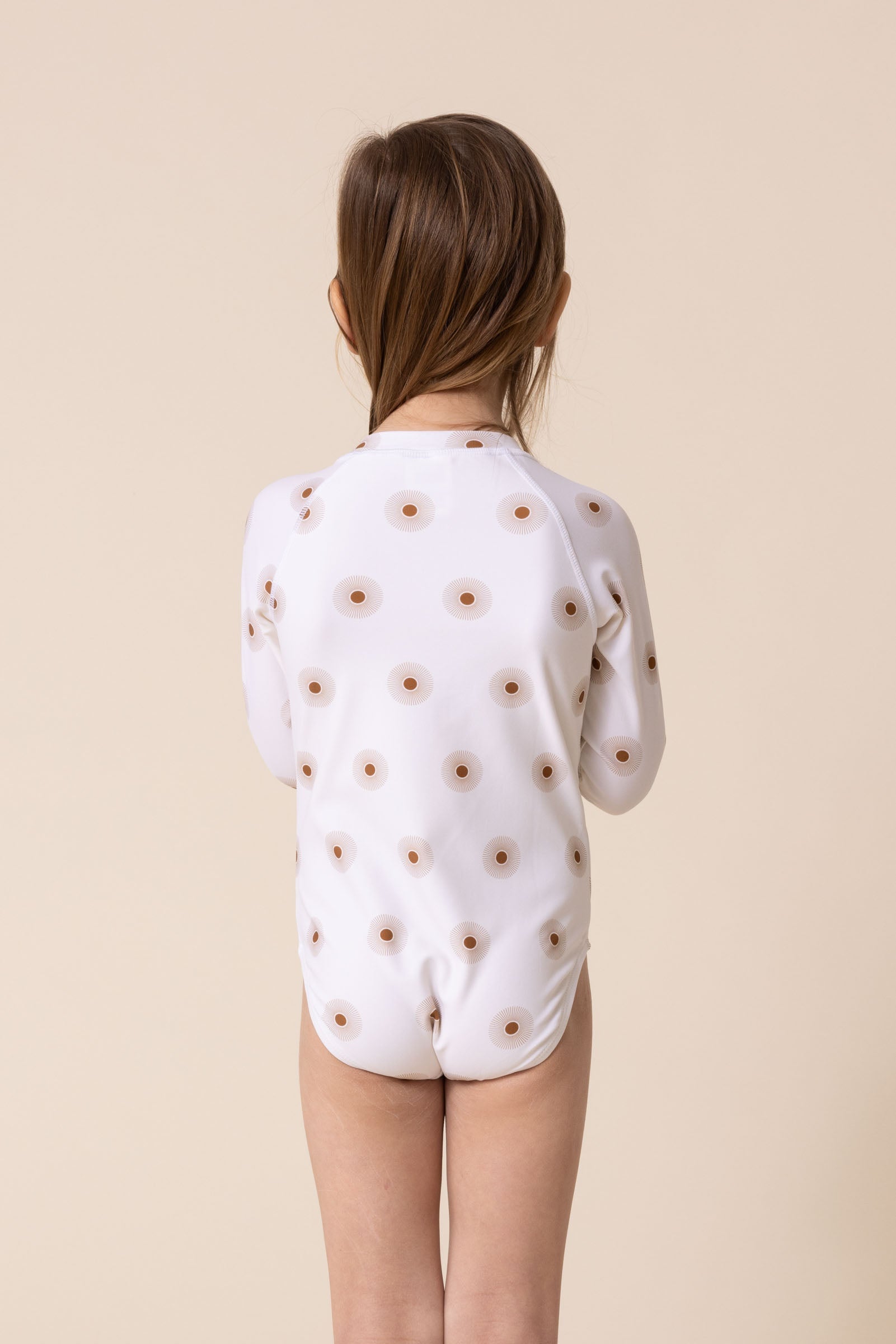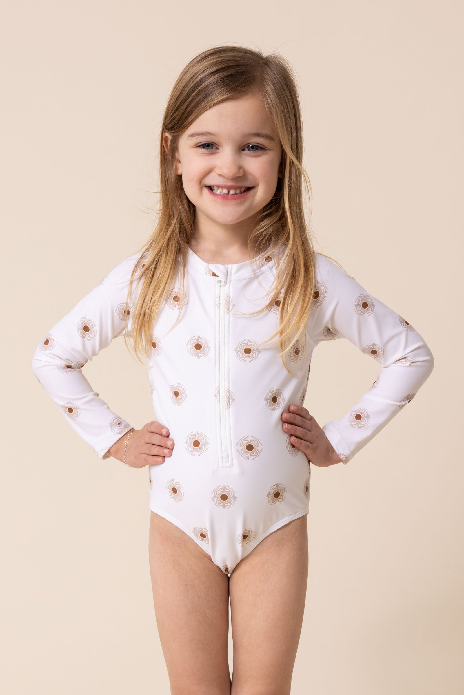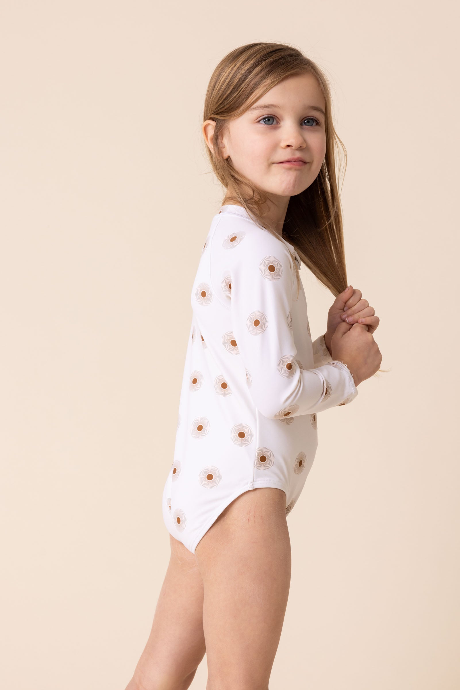 Make a splash with this adorable rashguard swimsuit for girls! Its white floral print adds a touch of charm to your little one's beach look, while also providing protection from the sun. Perfect for a day of fun in the sun! (P.S. it's also machine washable!)