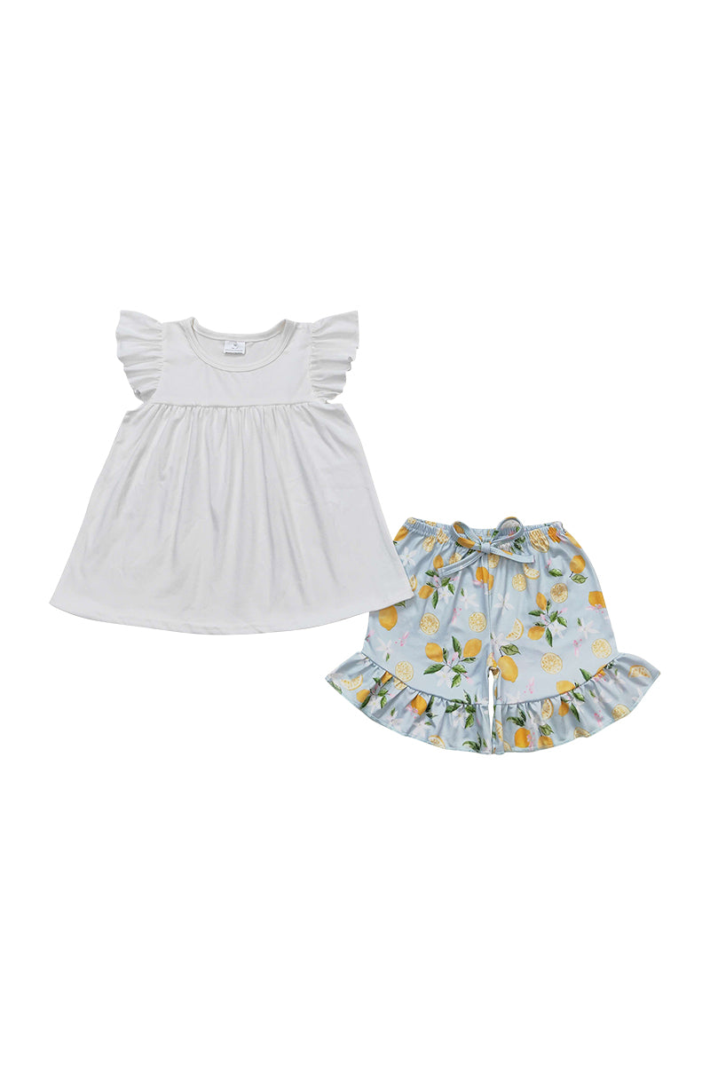 Get ready to add a pop of fun to your little girl's wardrobe with our White Lemon Print Girl Ruffle Shorts Set! The vibrant lemon print and playful ruffle design make this set perfect for any sunny day. Say goodbye to boring outfits and hello to style and comfort!