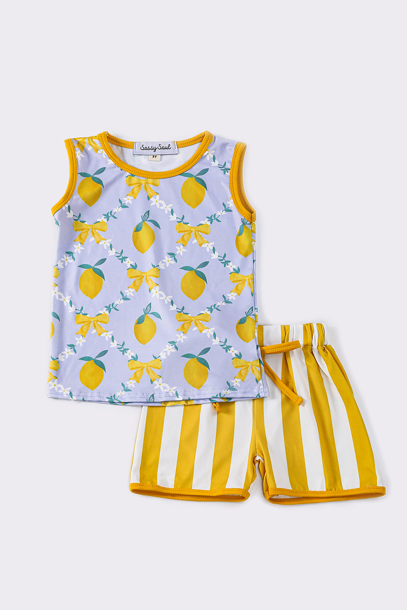 Introducing the Yellow Lemon Girl Shorts Set - the perfect outfit for any sunny day! These shorts feature a playful lemon pattern that is sure to brighten up any wardrobe. Made with comfortable and durable materials, these shorts are perfect for any outdoor adventure. Get ready to look and feel effortlessly cool with this set!