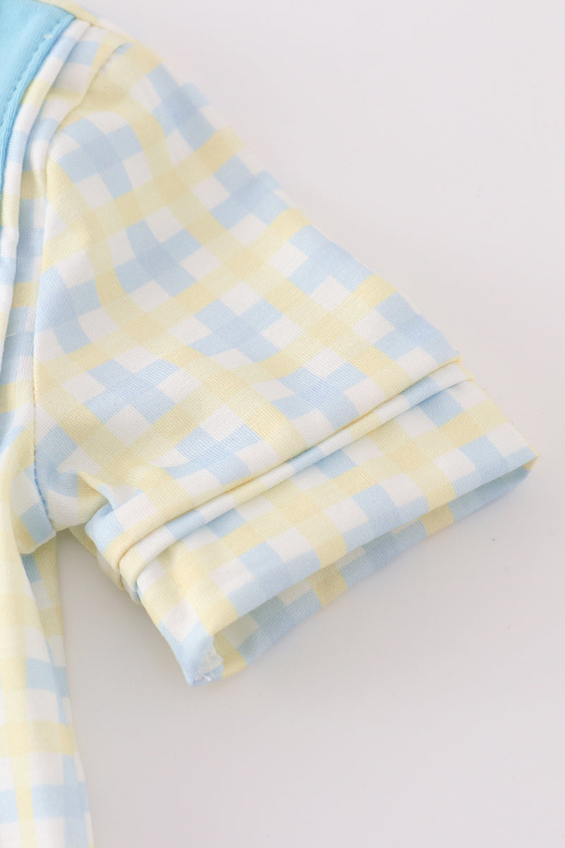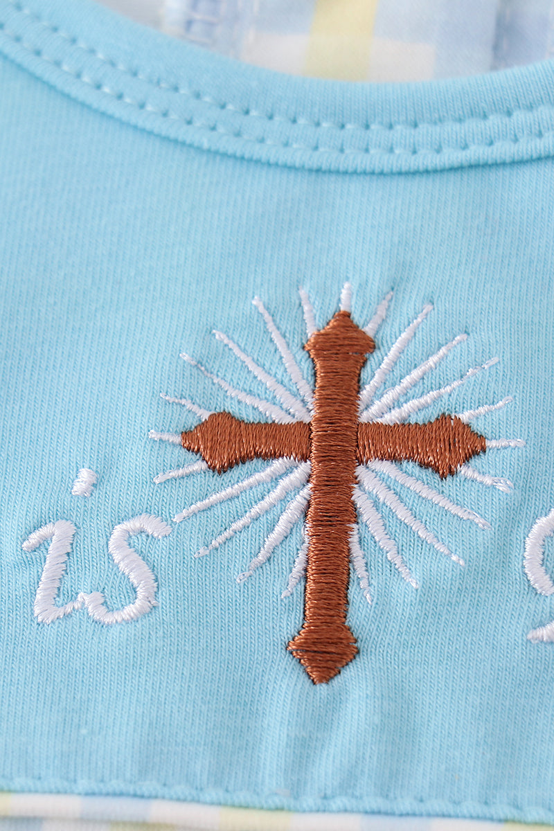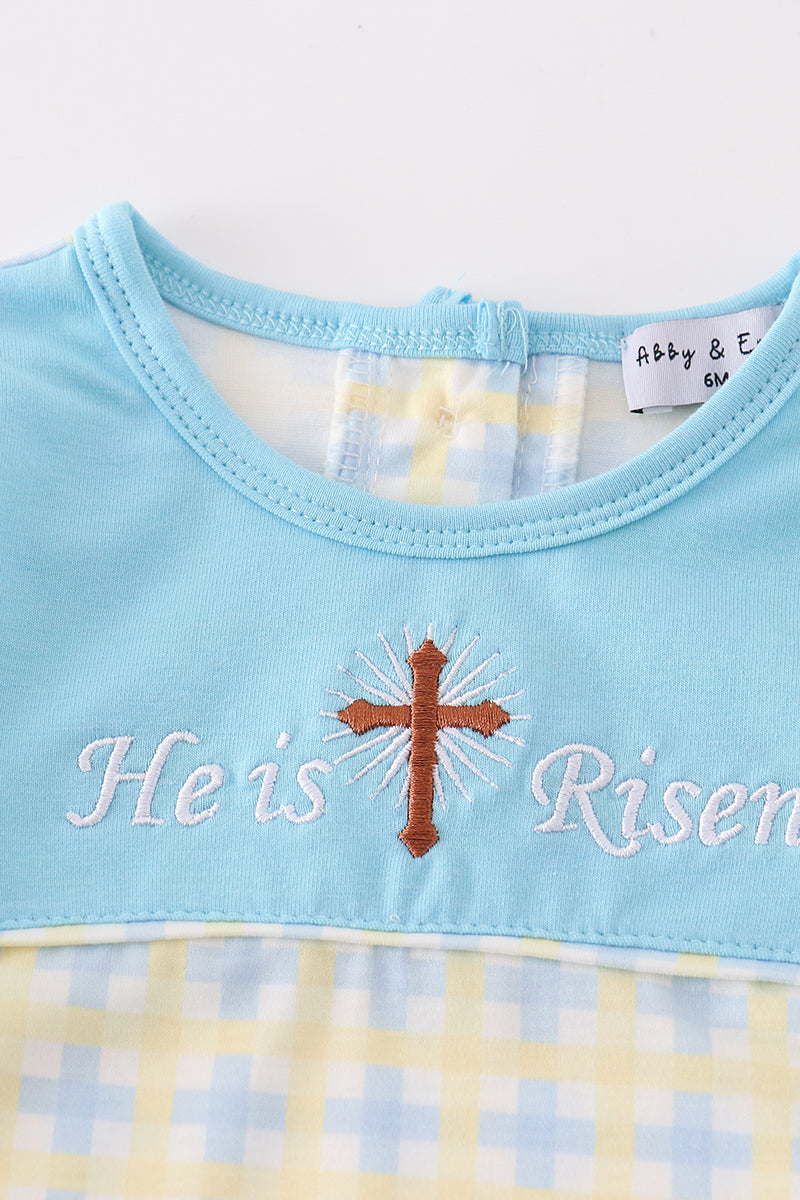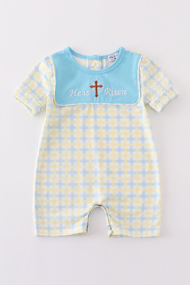 Get ready for spring with this adorable yellow plaid romper, featuring a fun "he is risen" embroidery. Perfect for your little boy to celebrate Easter in style. Made with high-quality materials for long-lasting comfort. Hop to it and grab one today!