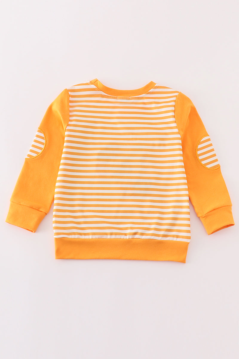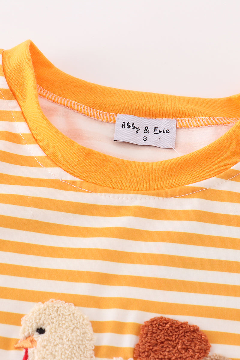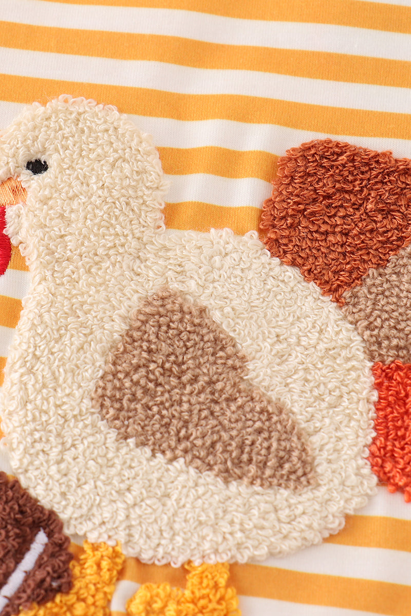 This playful, quirky boy's top features a charming Thanksgiving turkey french knot design on a vibrant yellow stripe background. A unique addition to any holiday wardrobe. Gobble it up before it's gone!