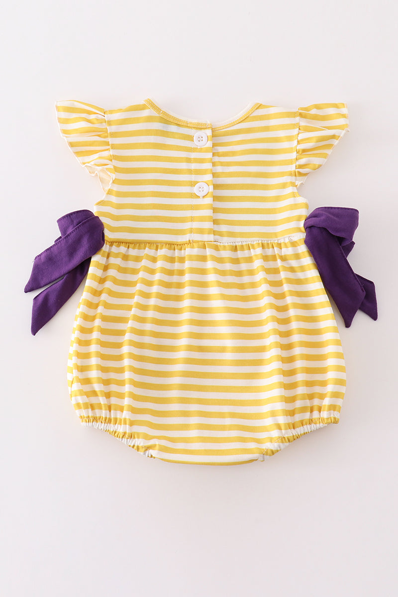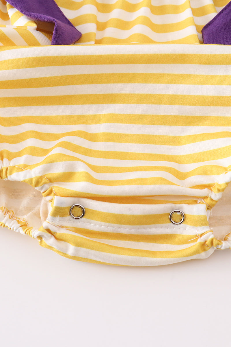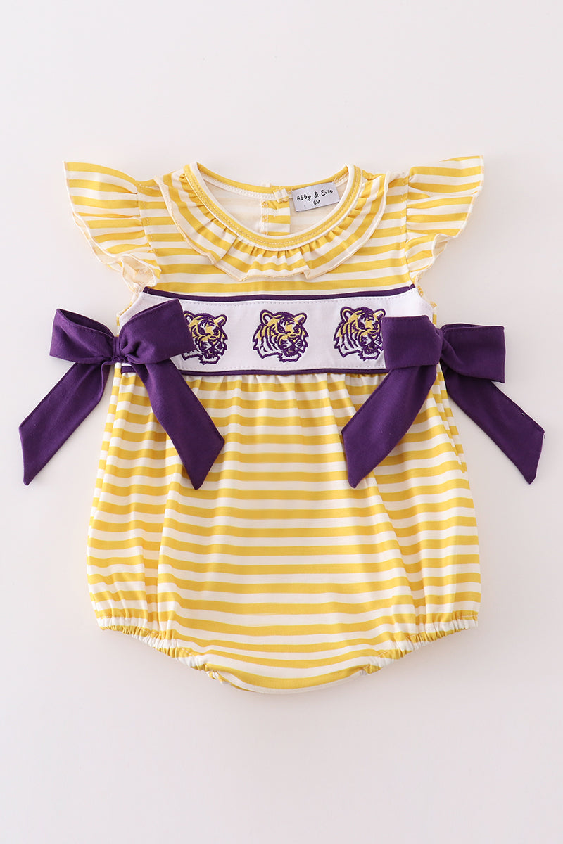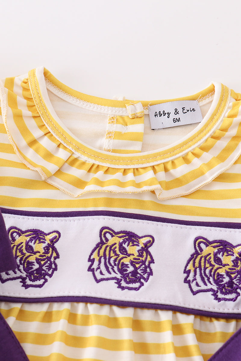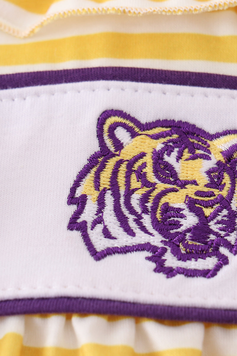 Unleash your little one's wild side with our Yellow Tiger Embroidery LSU Girl Bubble! This playful bubble features a fierce tiger embroidery and the iconic LSU logo, perfect for any little fan. Made with soft and breathable fabric, this bubble will keep your little one comfortable while they show off their team pride. Geaux Tigers!